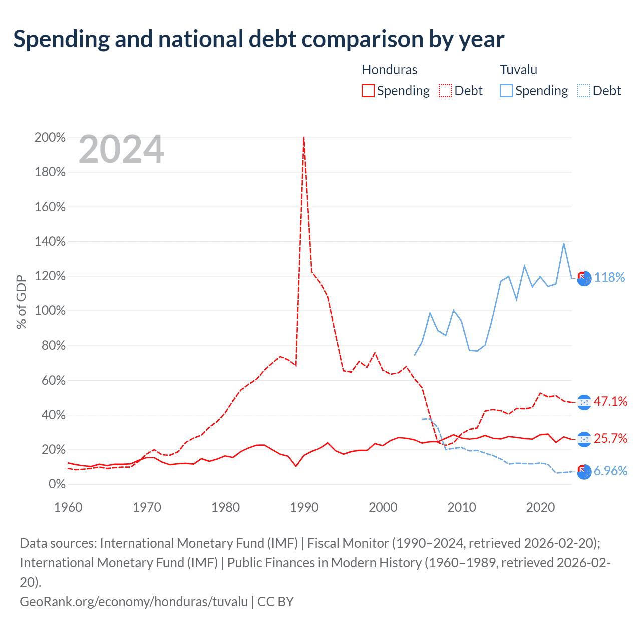 Honduras has $17.5B in government debt (47.1% of GDP), compared to $4.15M (6.96% of GDP) in Tuvalu.