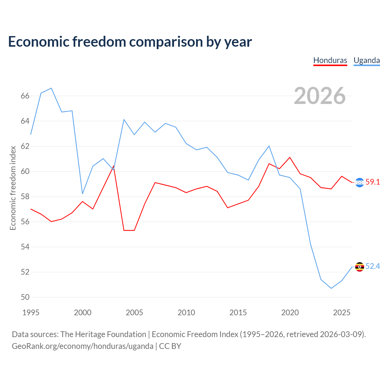 The Economic Freedom Index for Honduras is 59.1, ranking 105/197, compared to 52.4 for Uganda, ranking 149/197. The chart above displays a comparison of annual changes in economic freedom indexes.