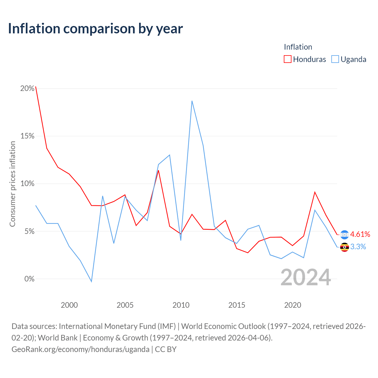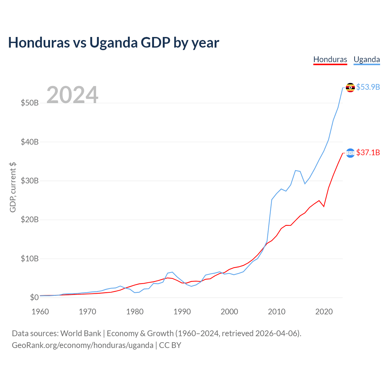 Honduras has a GDP of $37.1B compared to $53.9B for Uganda, ranking 104/197 and 89/197 by economy size, respectively.