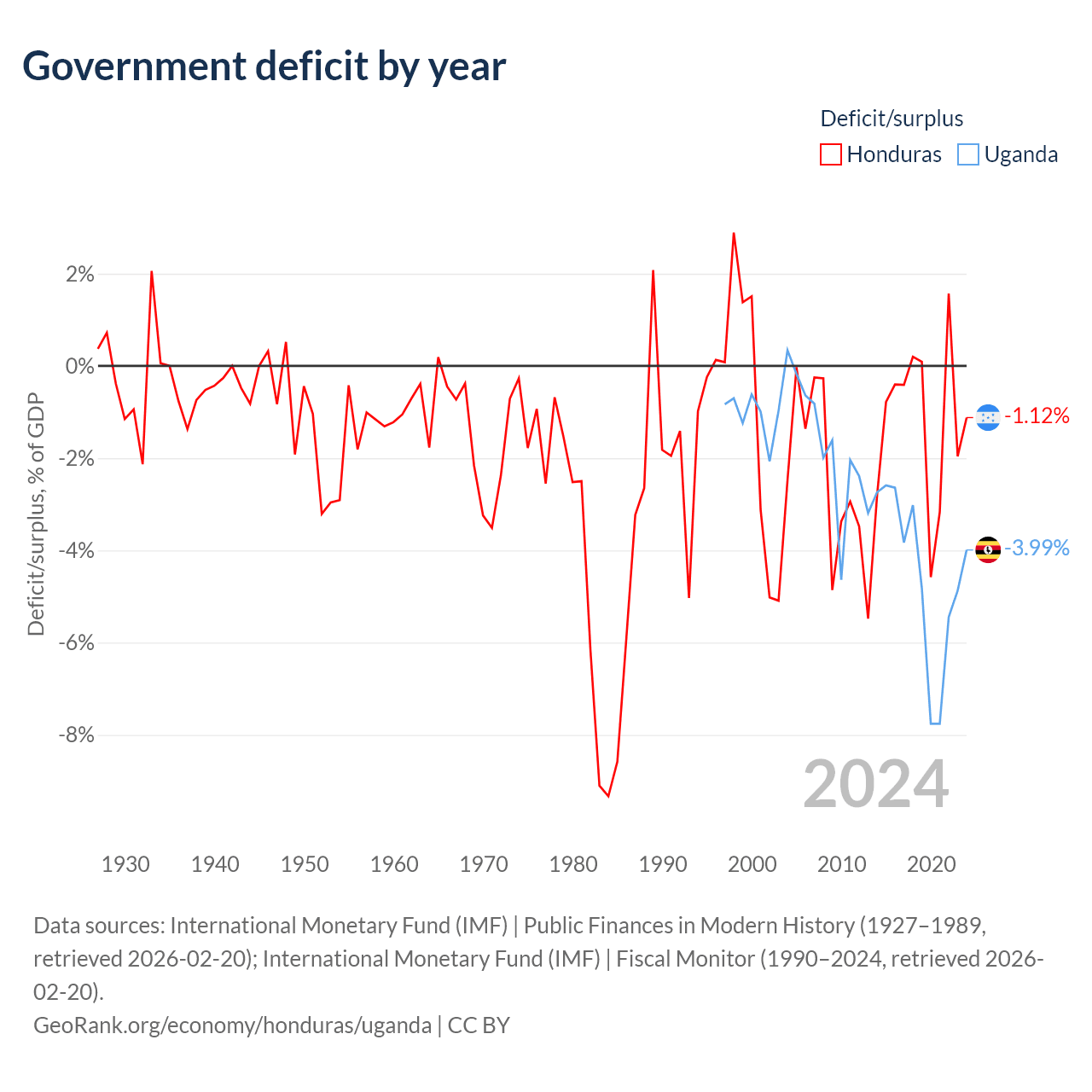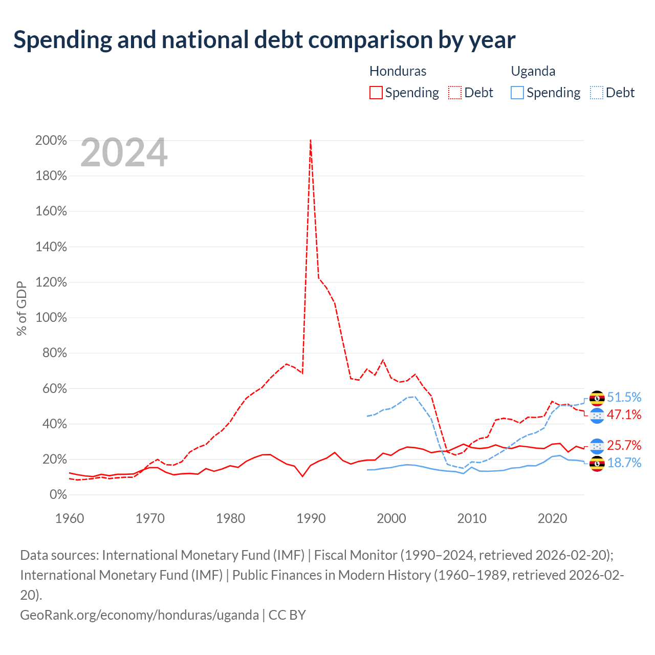 Honduras has $17.5B in government debt (47.1% of GDP), compared to $27.8B (51.5% of GDP) in Uganda.