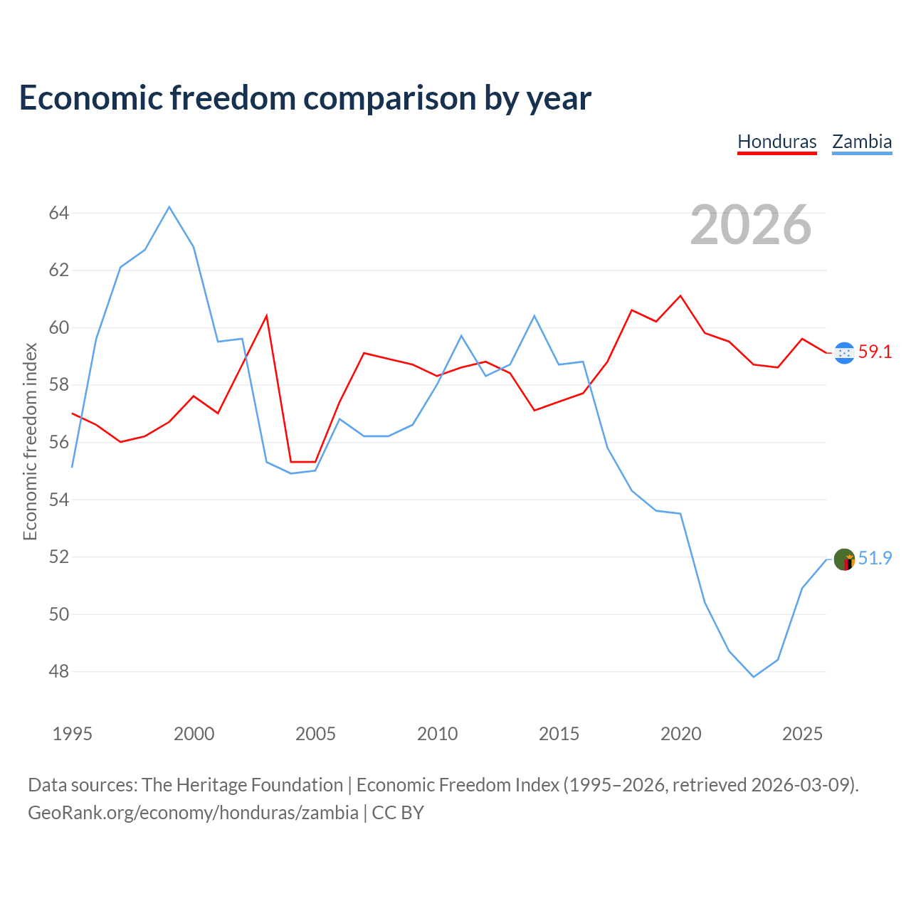 The Economic Freedom Index for Honduras is 59.1, ranking 105/197, compared to 51.9 for Zambia, ranking 152/197. The chart above displays a comparison of annual changes in economic freedom indexes.