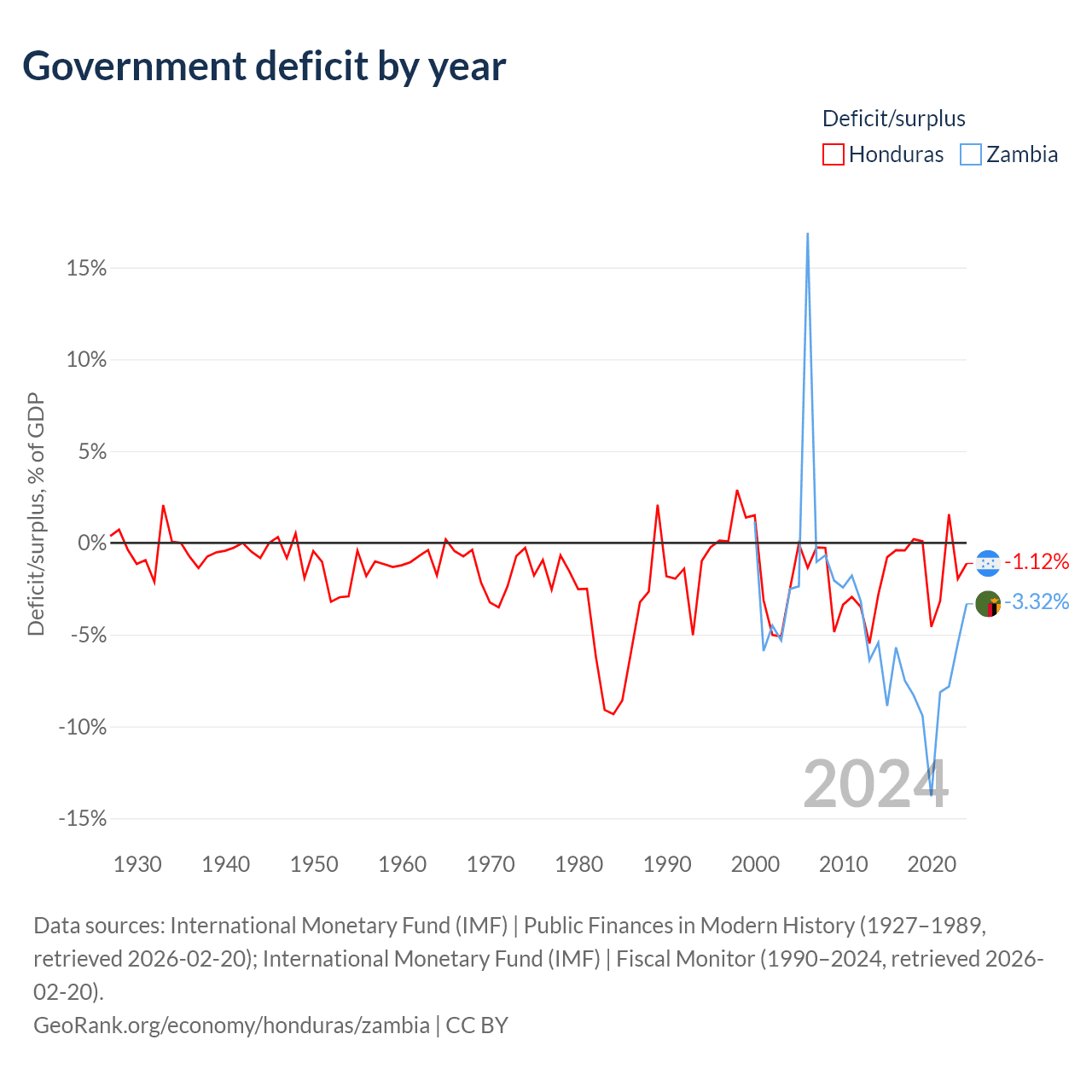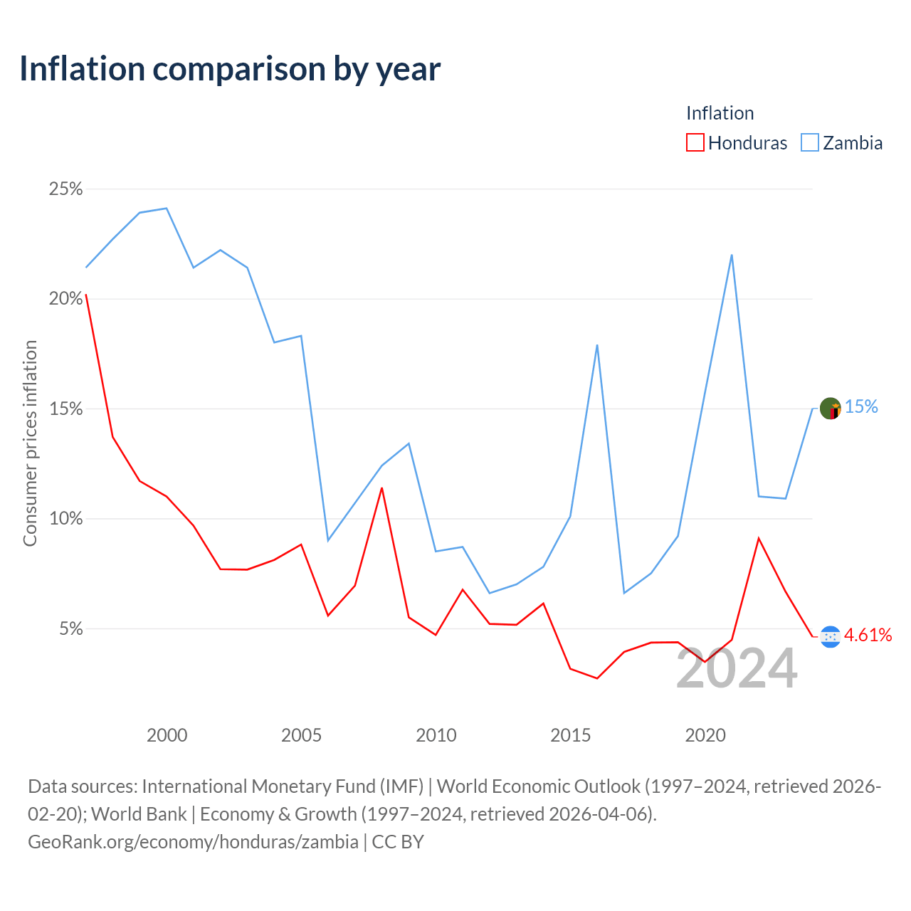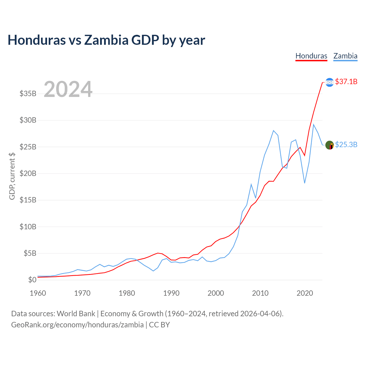 Honduras has a GDP of $37.1B compared to $25.3B for Zambia, ranking 104/197 and 116/197 by economy size, respectively.