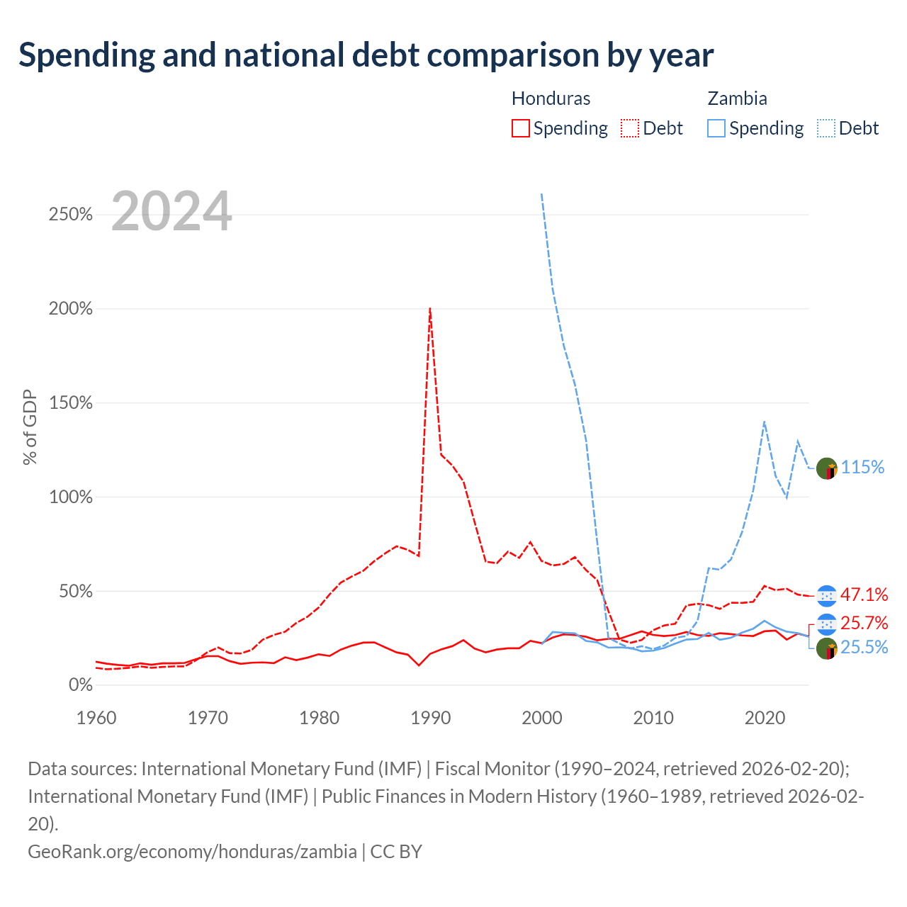 Honduras has $17.5B in government debt (47.1% of GDP), compared to $29.1B (114.9% of GDP) in Zambia.