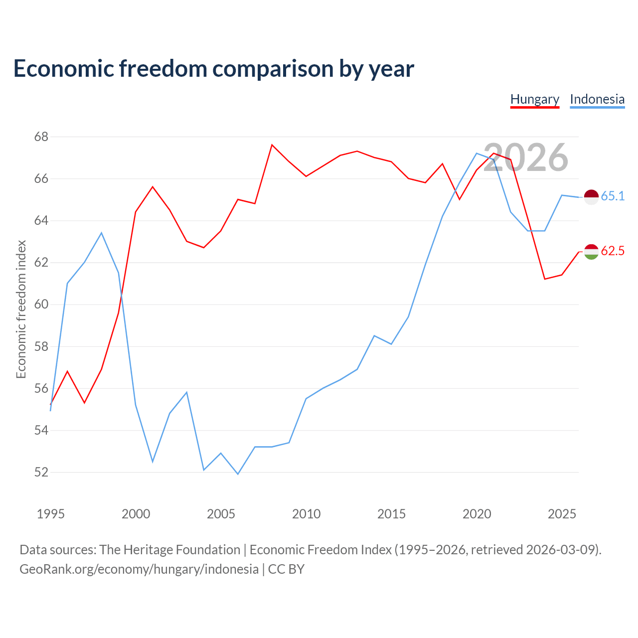 The Economic Freedom Index for Hungary is 62.5, ranking 86/197, compared to 65.1 for Indonesia, ranking 67/197. The chart above displays a comparison of annual changes in economic freedom indexes.