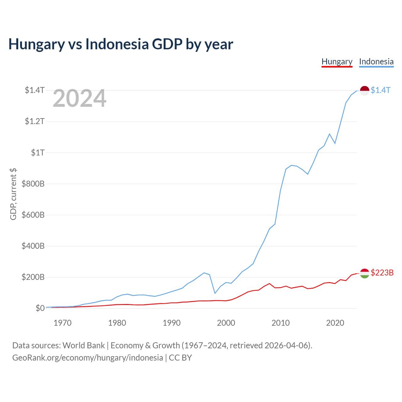 Hungary has a GDP of $223B compared to $1.4T for Indonesia, ranking 55/197 and 16/197 by economy size, respectively.