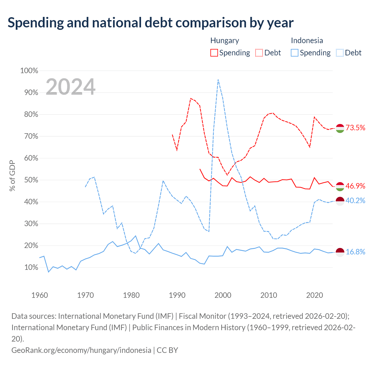 Hungary has $164B in government debt (73.5% of GDP), compared to $561B (40.2% of GDP) in Indonesia.