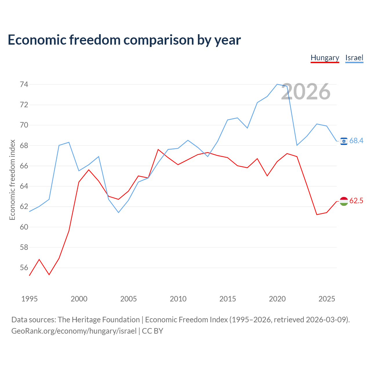 The Economic Freedom Index for Hungary is 62.5, ranking 86/197, compared to 68.4 for Israel, ranking 47/197. The chart above displays a comparison of annual changes in economic freedom indexes.