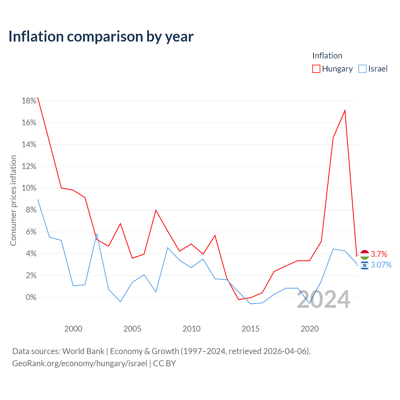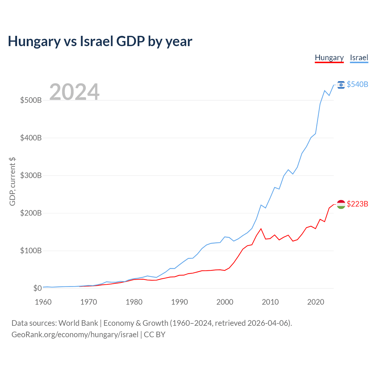 Hungary has a GDP of $223B compared to $540B for Israel, ranking 55/197 and 29/197 by economy size, respectively.