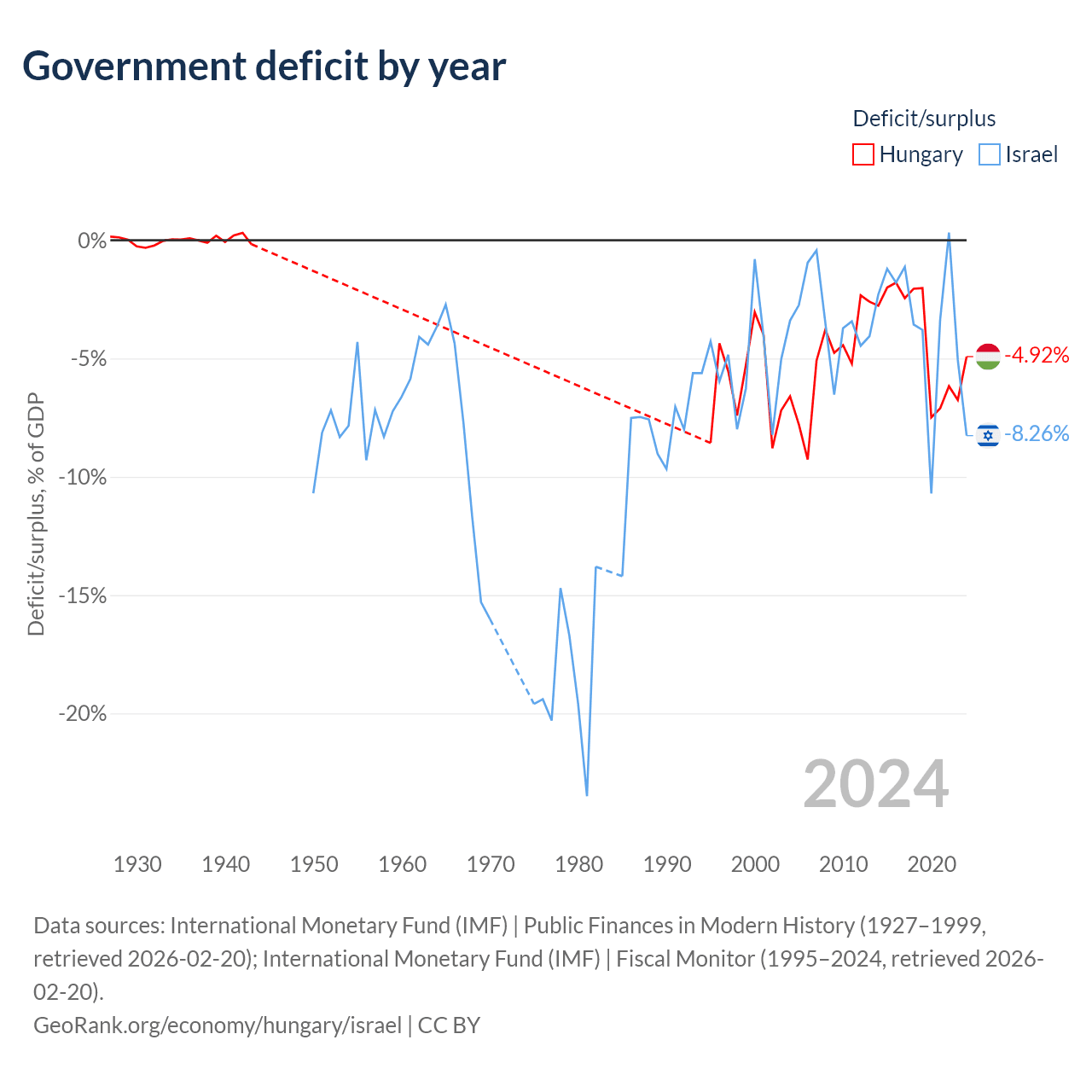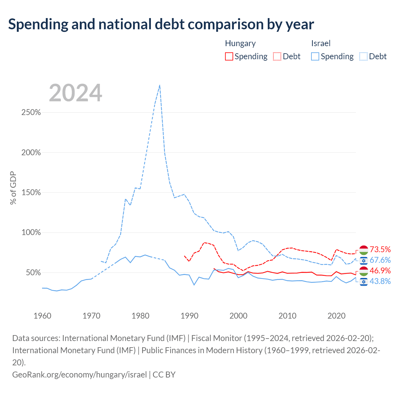 Hungary has $164B in government debt (73.5% of GDP), compared to $366B (67.6% of GDP) in Israel.