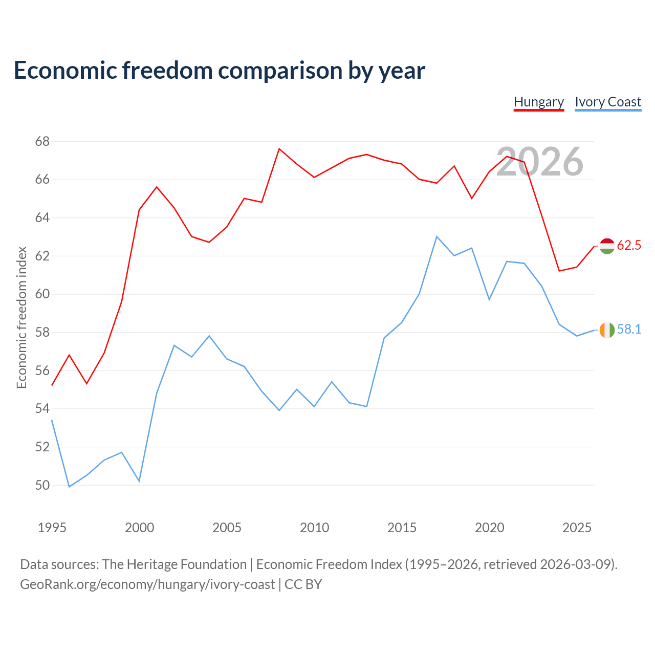 The Economic Freedom Index for Hungary is 62.5, ranking 86/197, compared to 58.1 for Ivory Coast, ranking 111/197. The chart above displays a comparison of annual changes in economic freedom indexes.