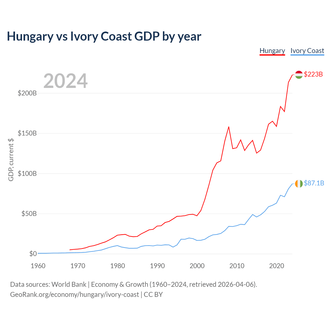 Hungary has a GDP of $223B compared to $87.1B for Ivory Coast, ranking 55/197 and 77/197 by economy size, respectively.