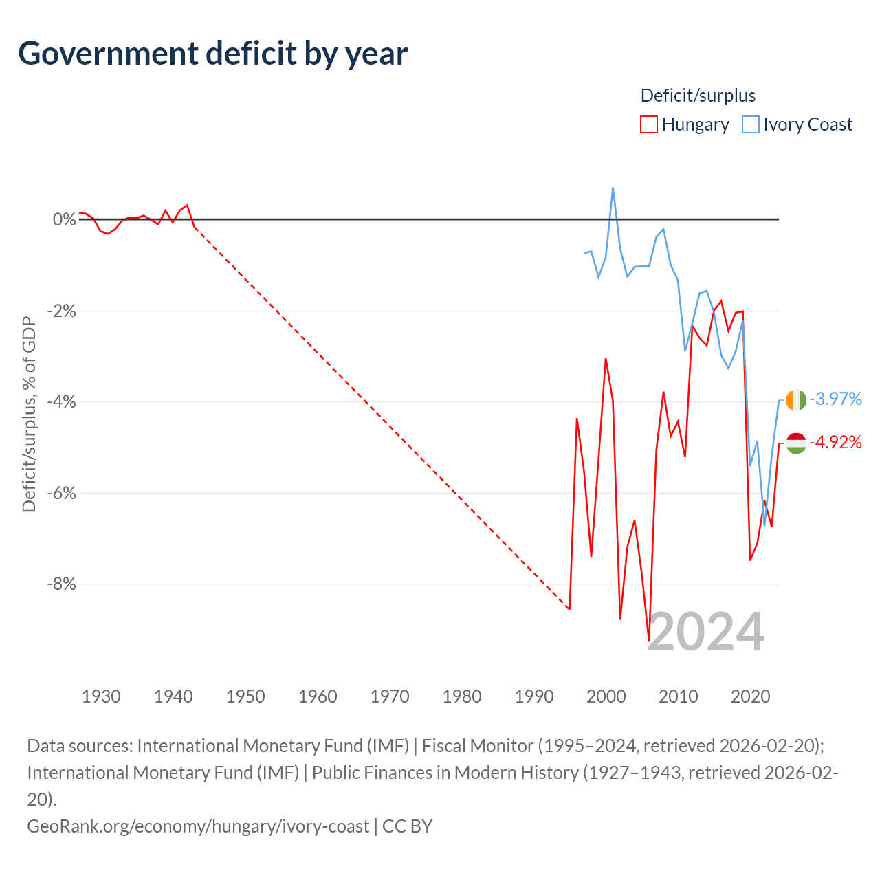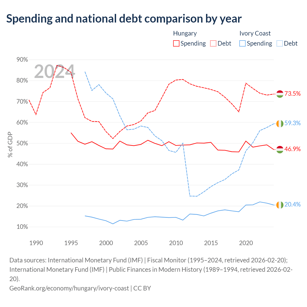 Hungary has $164B in government debt (73.5% of GDP), compared to $51.6B (59.3% of GDP) in Ivory Coast.