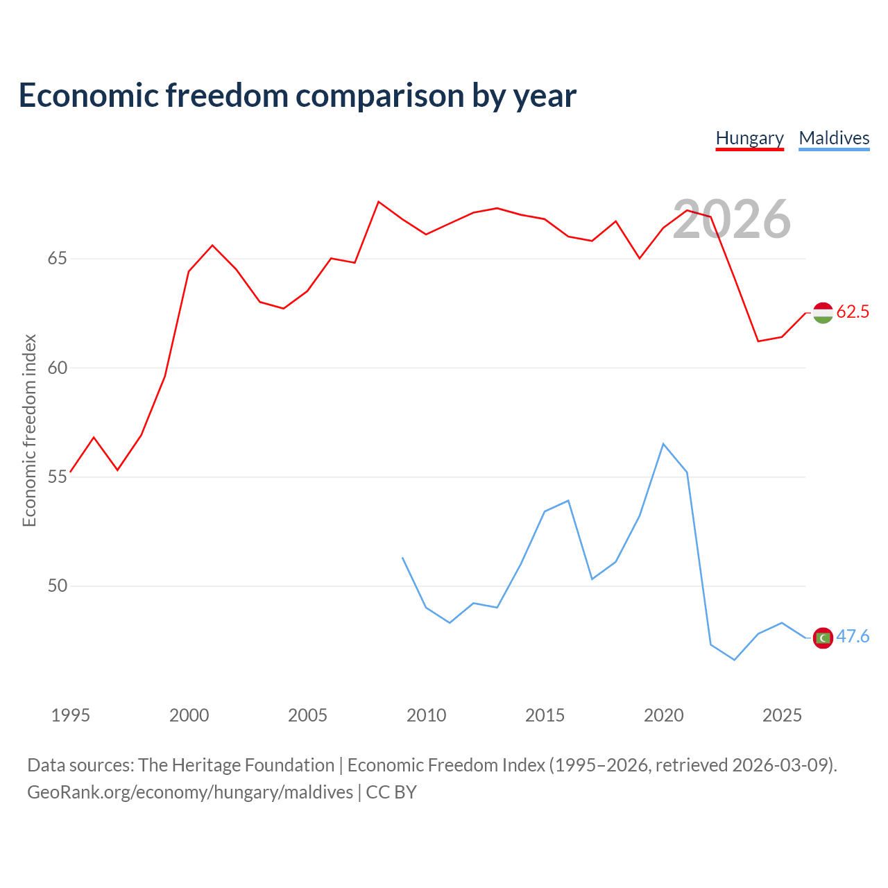 The Economic Freedom Index for Hungary is 62.5, ranking 86/197, compared to 47.6 for Maldives, ranking 174/197. The chart above displays a comparison of annual changes in economic freedom indexes.