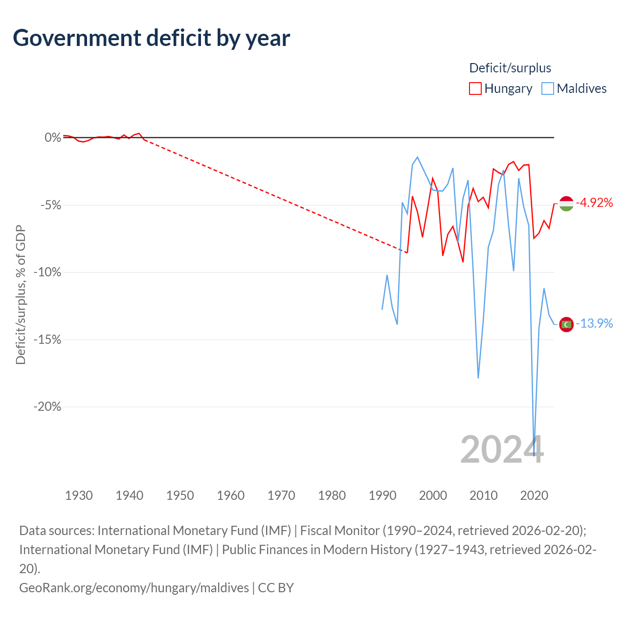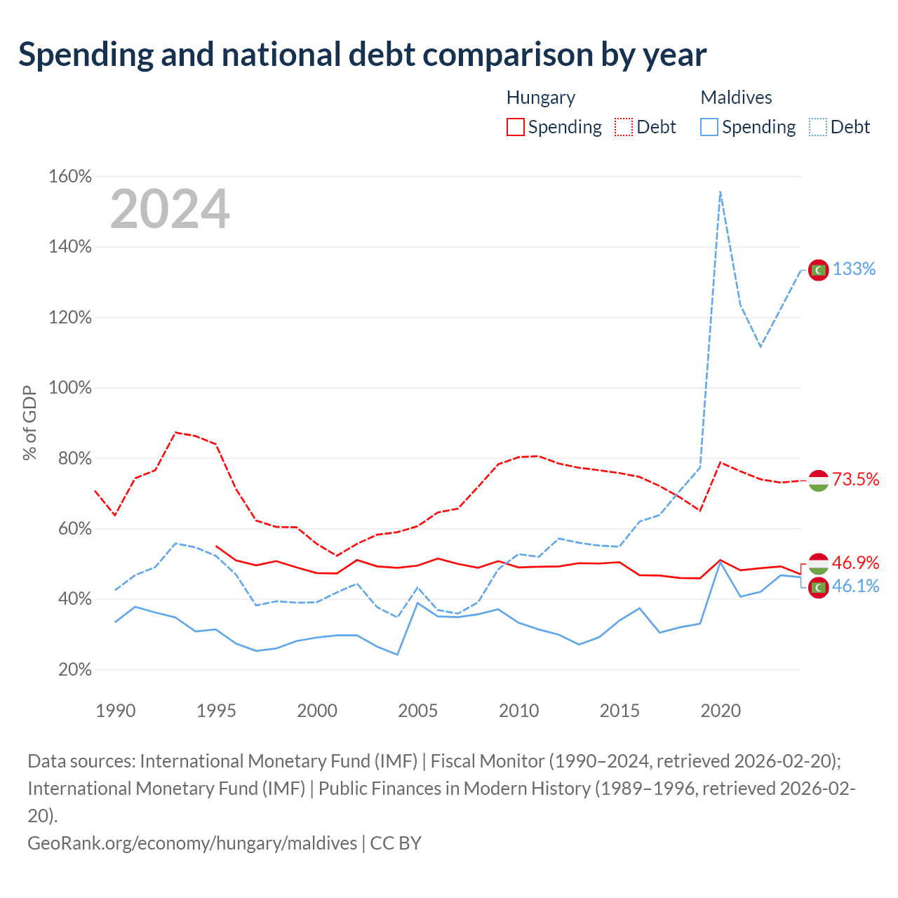 Hungary has $164B in government debt (73.5% of GDP), compared to $9.41B (133.3% of GDP) in Maldives.