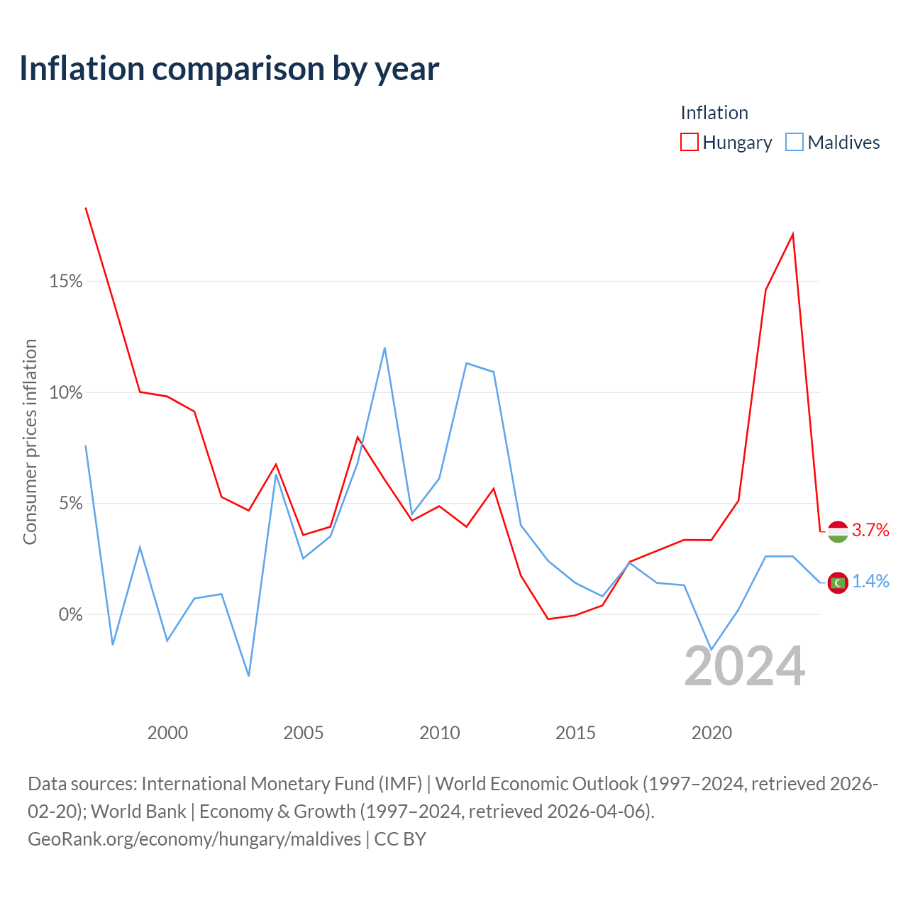 Hungary has a GDP of $223B compared to $7.06B for Maldives, ranking 55/197 and 159/197 by economy size, respectively.