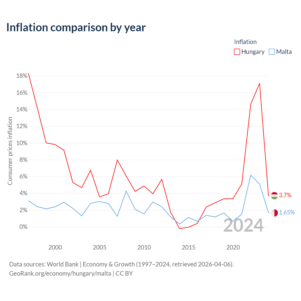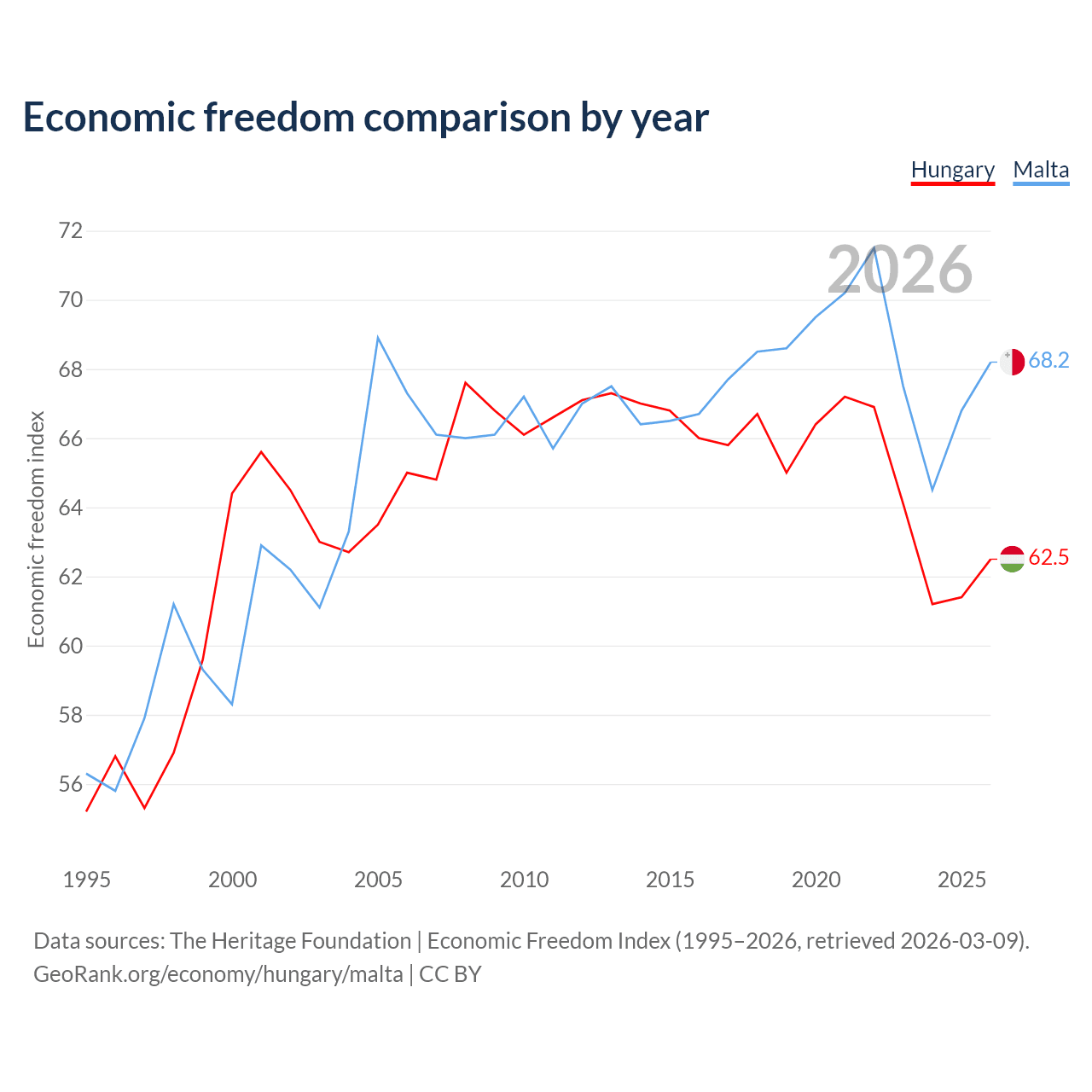 The Economic Freedom Index for Hungary is 62.5, ranking 86/197, compared to 68.2 for Malta, ranking 49/197. The chart above displays a comparison of annual changes in economic freedom indexes.