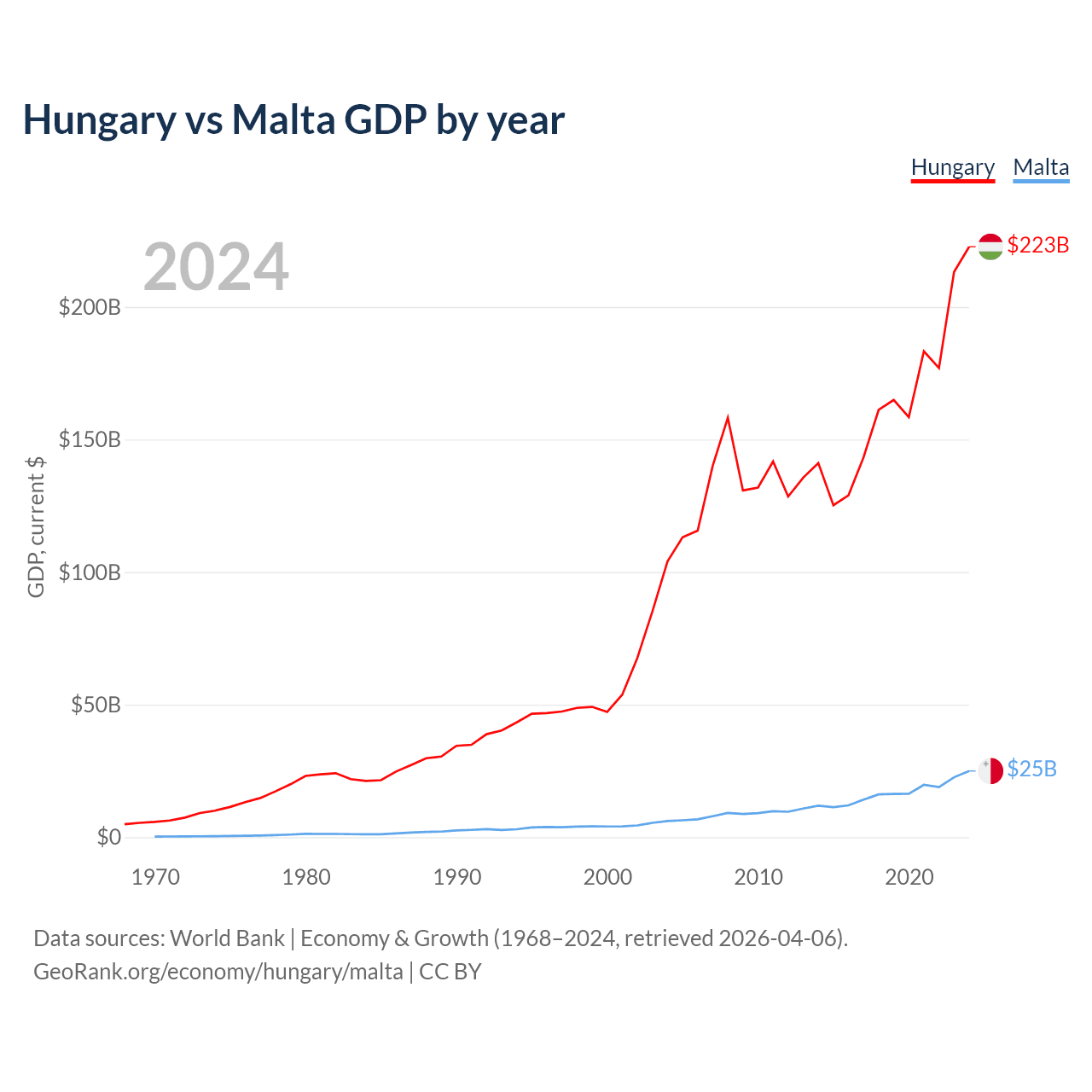 Hungary has a GDP of $223B compared to $25B for Malta, ranking 55/197 and 119/197 by economy size, respectively.
