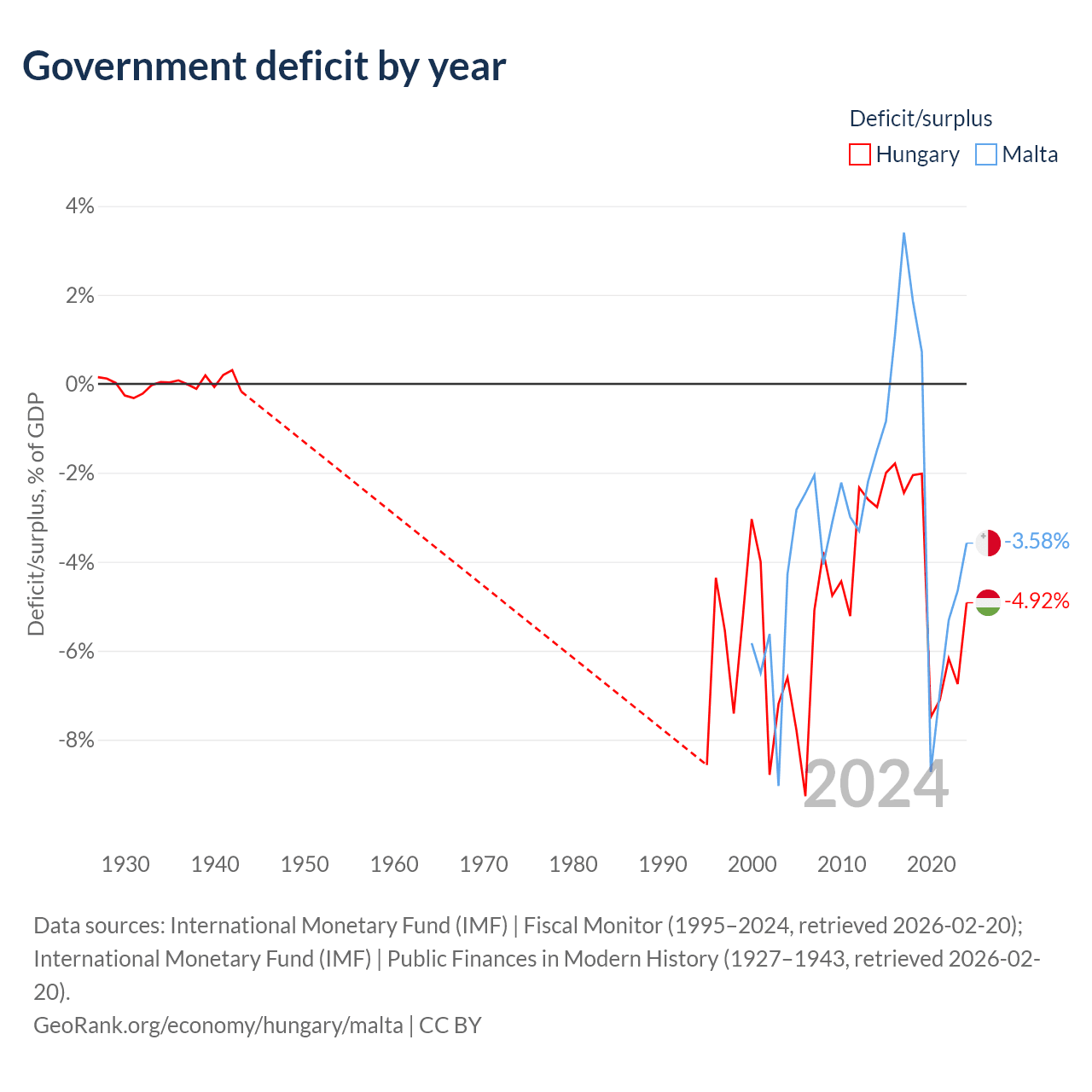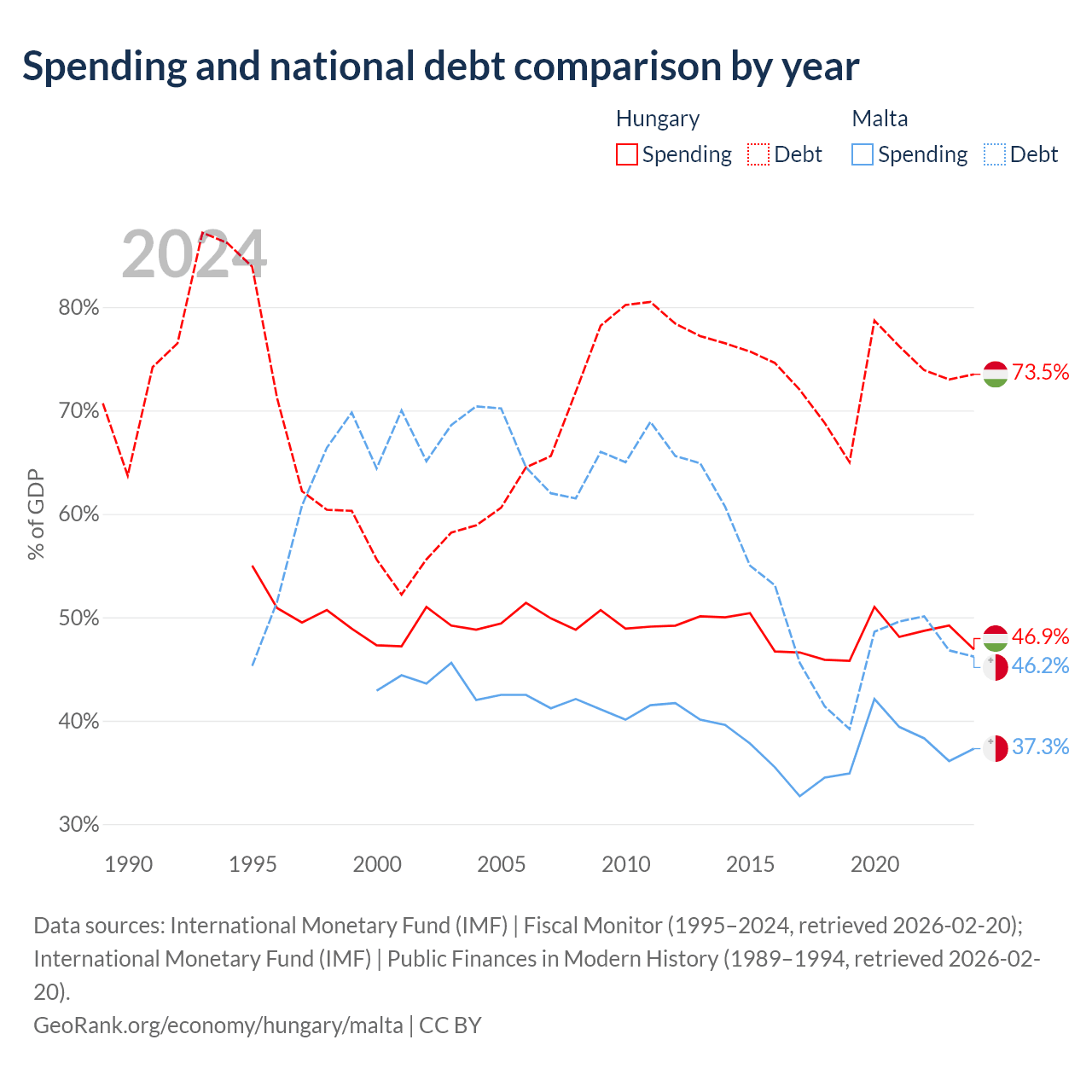 Hungary has $164B in government debt (73.5% of GDP), compared to $11.5B (46.2% of GDP) in Malta.