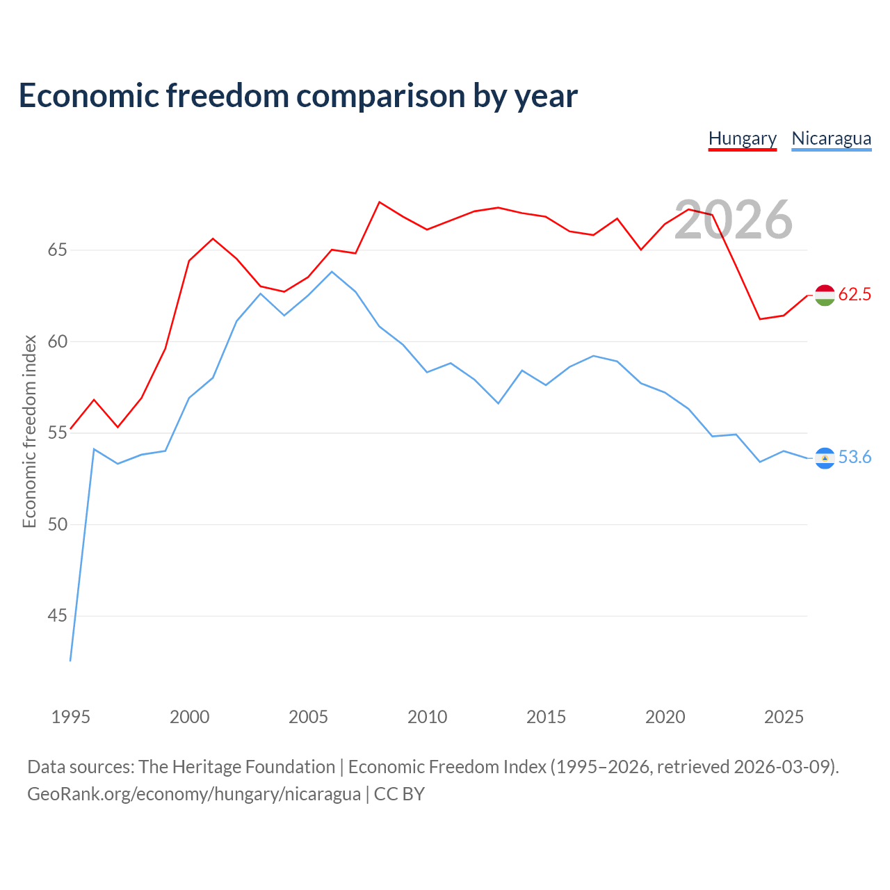 Data sources: The Heritage Foundation | Economic Freedom Index (1995–2026, retrieved 2026-03-09).