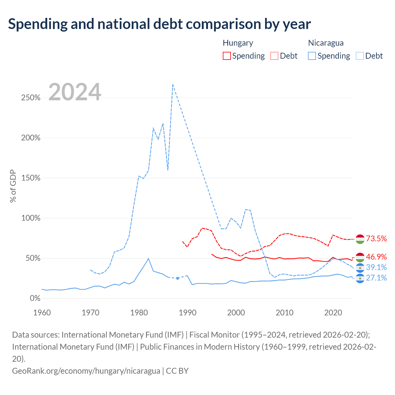 Hungary has $164B in government debt (73.5% of GDP), compared to $7.71B (39.1% of GDP) in Nicaragua.