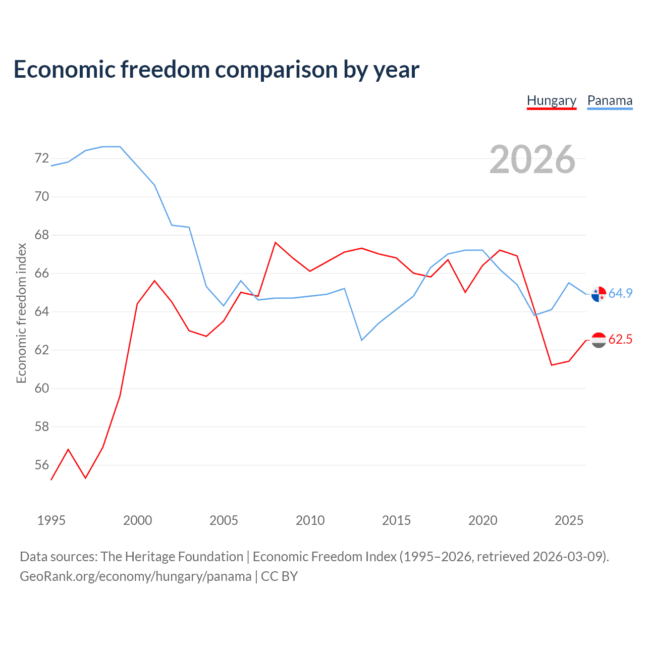 The Economic Freedom Index for Hungary is 62.5, ranking 86/197, compared to 64.9 for Panama, ranking 70/197. The chart above displays a comparison of annual changes in economic freedom indexes.