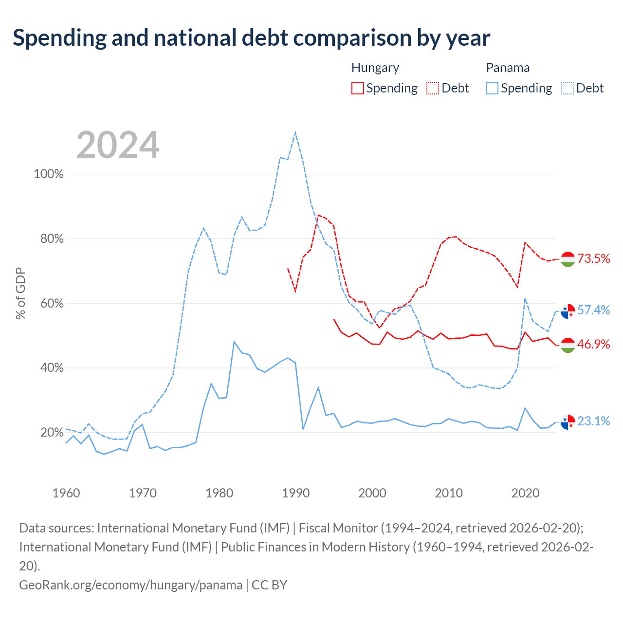 Hungary has $164B in government debt (73.5% of GDP), compared to $49.6B (57.4% of GDP) in Panama.