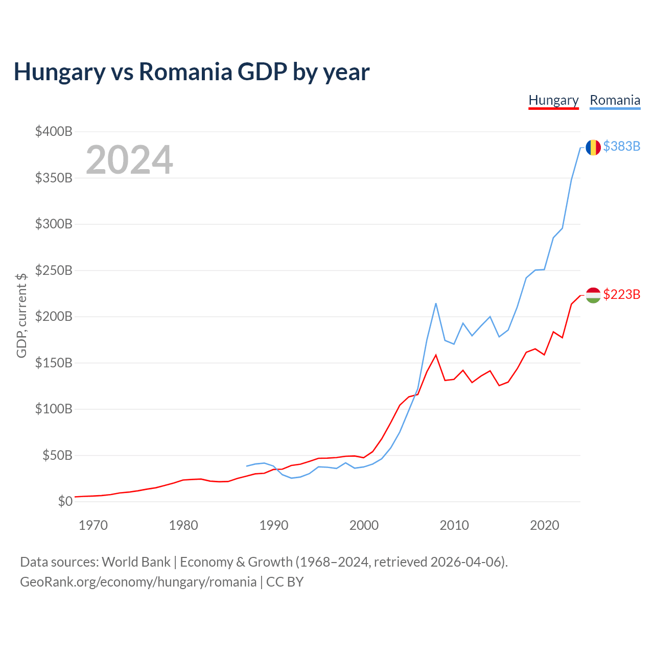 Hungary has a GDP of $223B compared to $383B for Romania, ranking 55/197 and 42/197 by economy size, respectively.