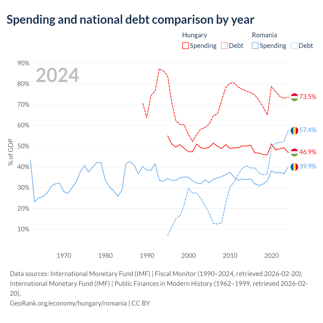 Hungary has $164B in government debt (73.5% of GDP), compared to $220B (57.4% of GDP) in Romania.