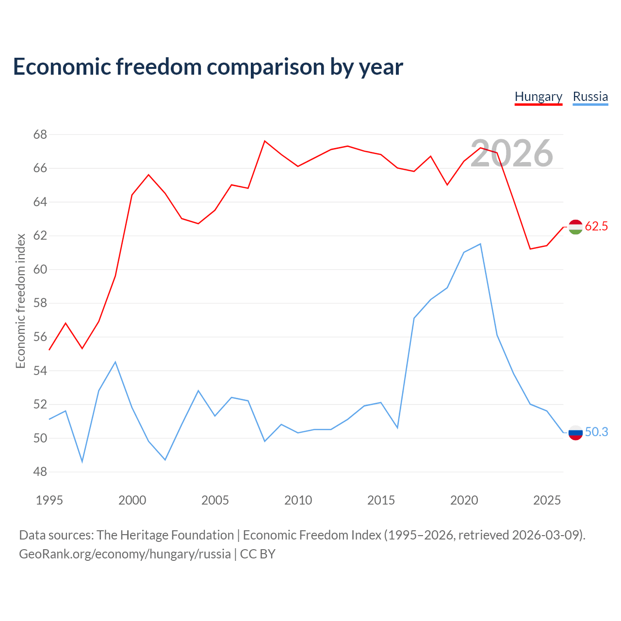 The Economic Freedom Index for Hungary is 62.5, ranking 86/197, compared to 50.3 for Russia, ranking 161/197. The chart above displays a comparison of annual changes in economic freedom indexes.