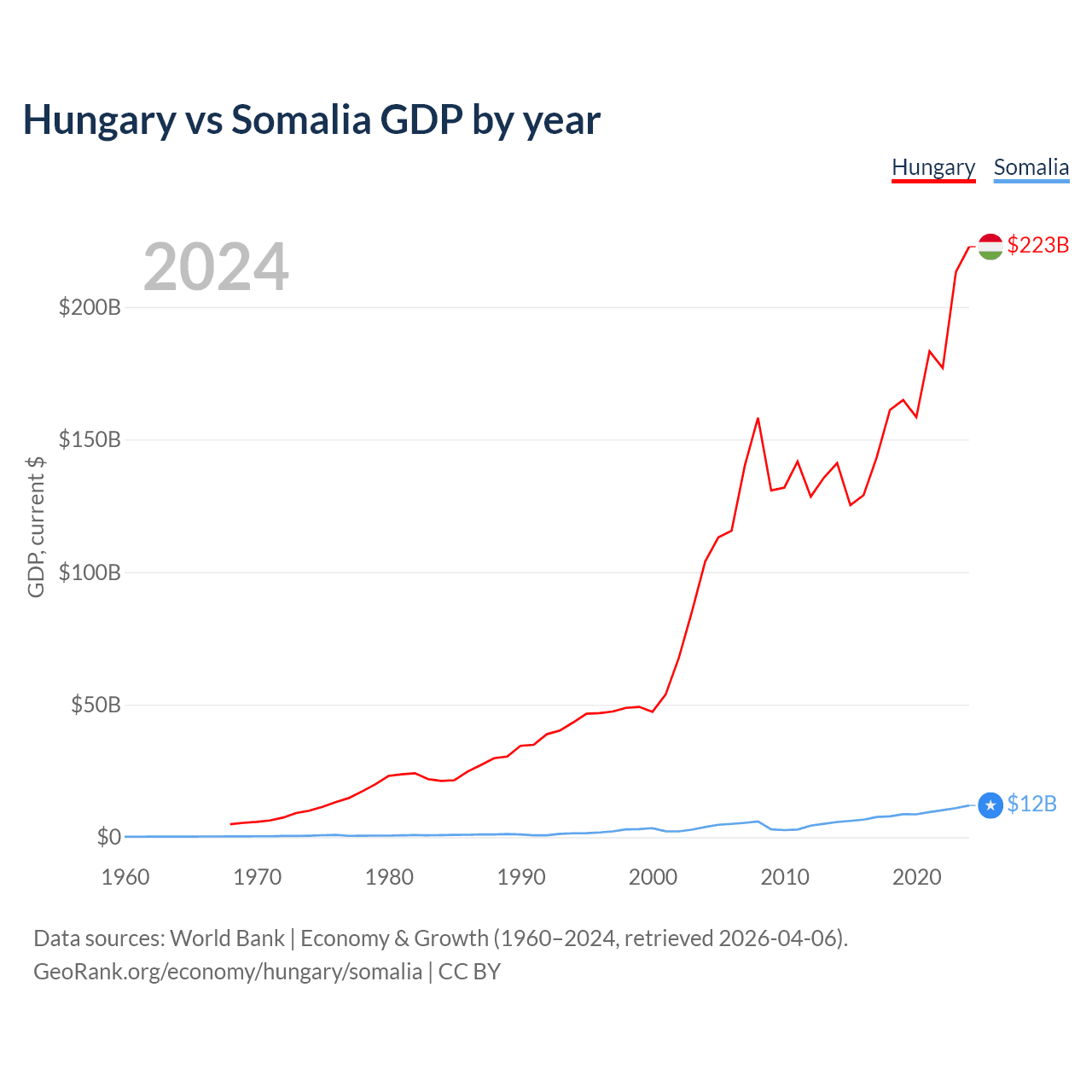 Hungary has a GDP of $223B compared to $12B for Somalia, ranking 55/197 and 150/197 by economy size, respectively.