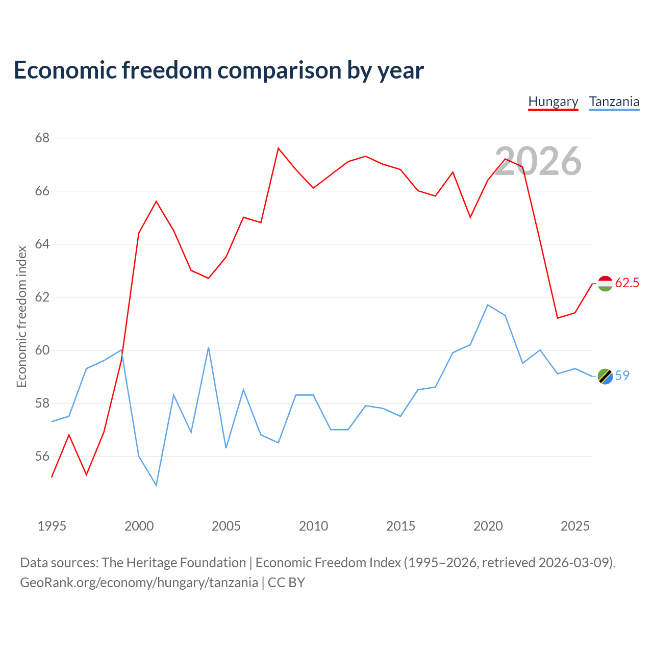 The Economic Freedom Index for Hungary is 62.5, ranking 86/197, compared to 59 for Tanzania, ranking 106/197. The chart above displays a comparison of annual changes in economic freedom indexes.