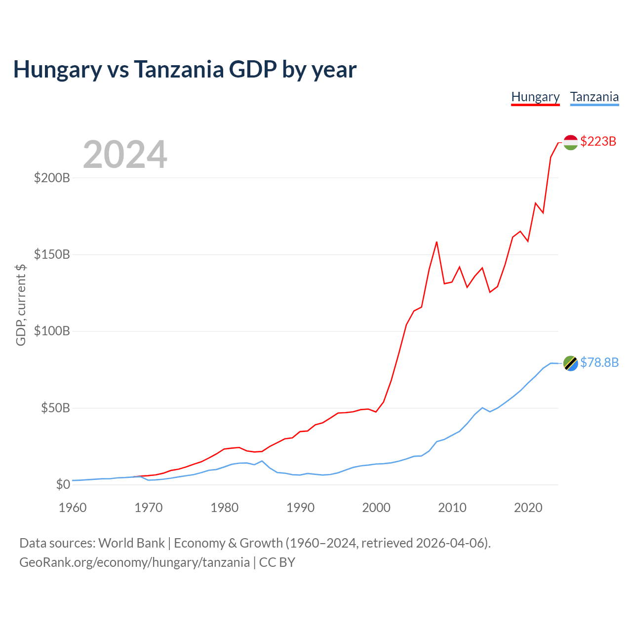 Hungary has a GDP of $223B compared to $78.8B for Tanzania, ranking 55/197 and 82/197 by economy size, respectively.