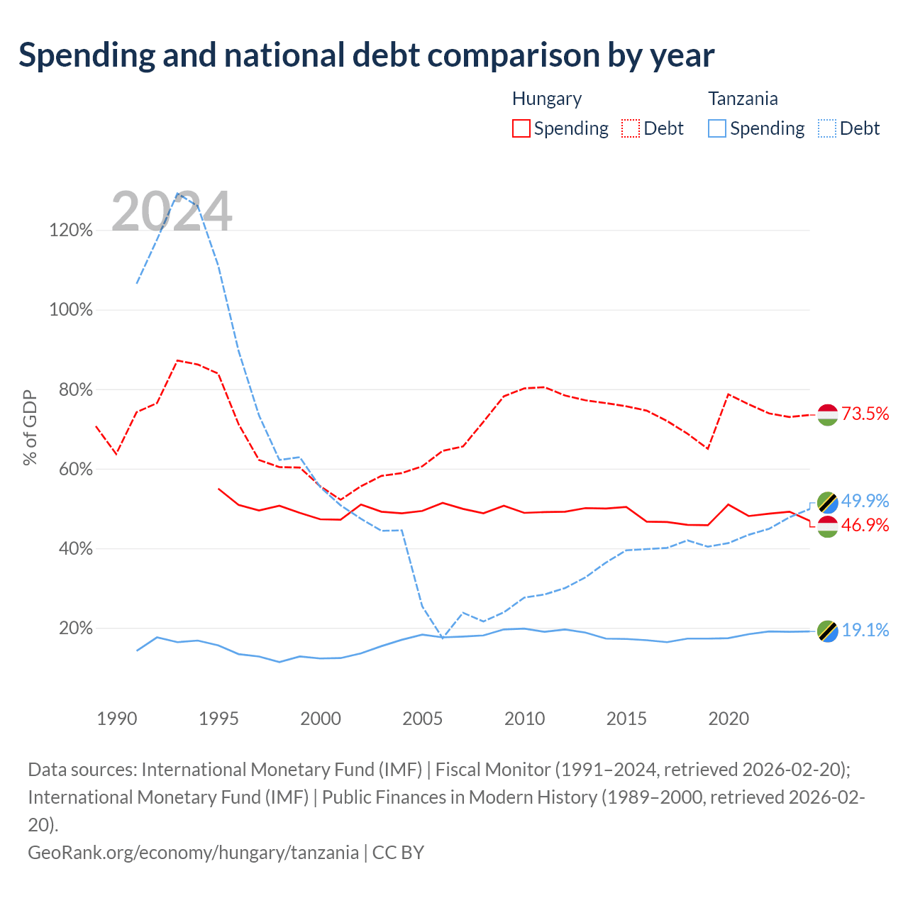 Hungary has $164B in government debt (73.5% of GDP), compared to $39.3B (49.9% of GDP) in Tanzania.
