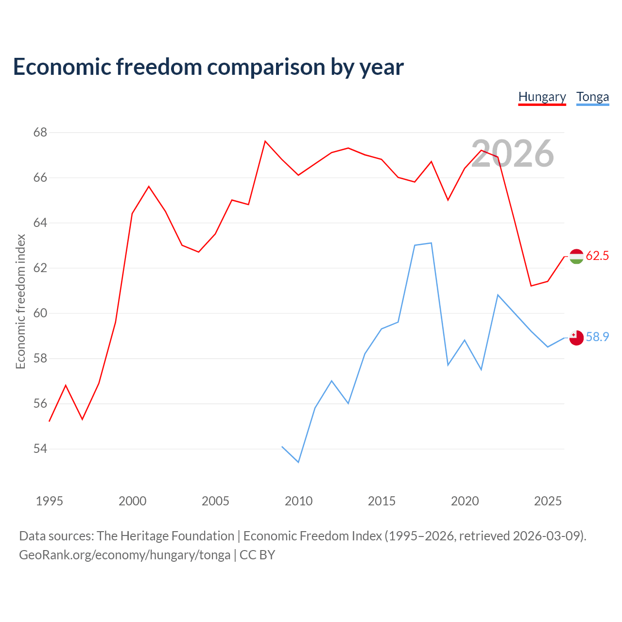 The Economic Freedom Index for Hungary is 62.5, ranking 86/197, compared to 58.9 for Tonga, ranking 107/197. The chart above displays a comparison of annual changes in economic freedom indexes.