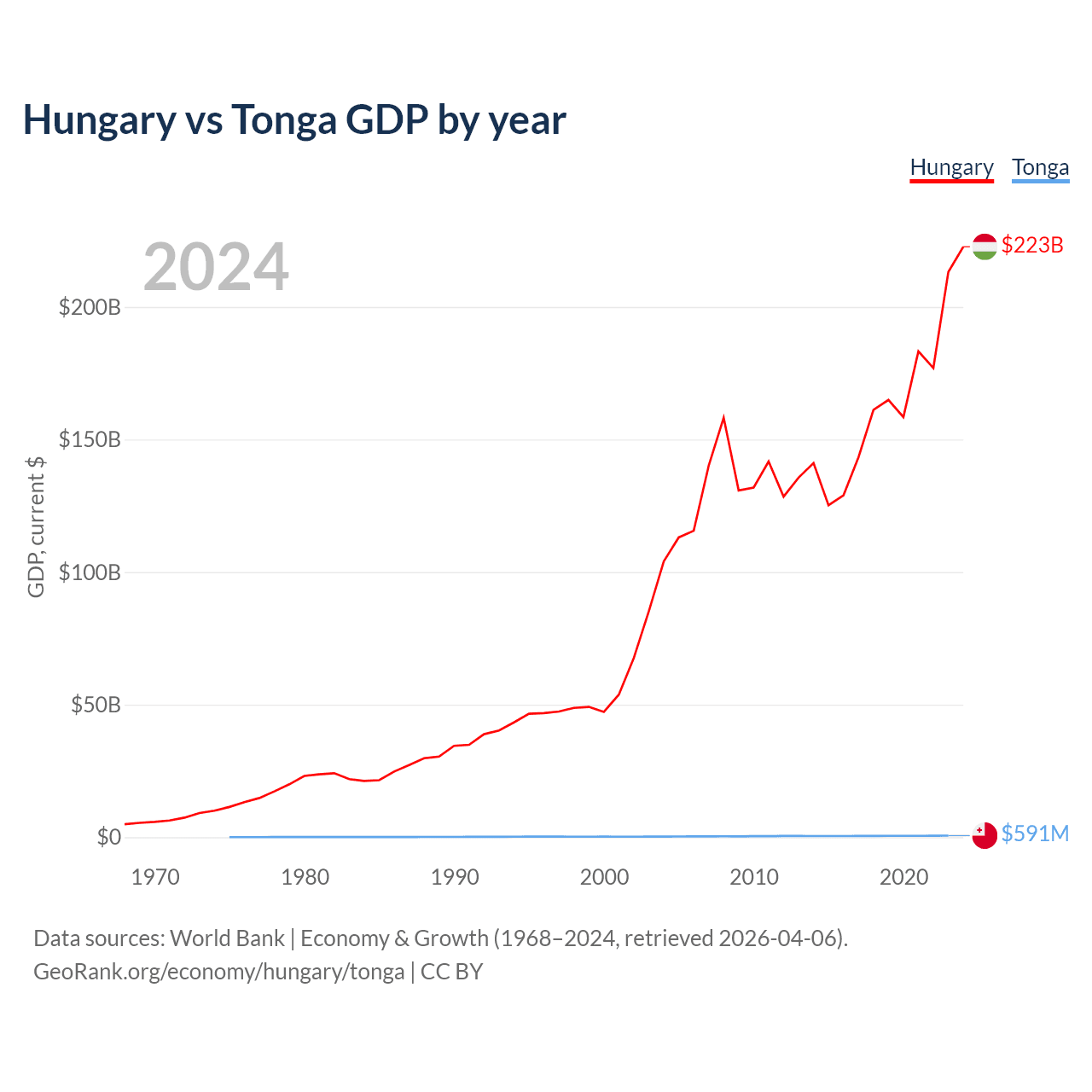 Hungary has a GDP of $223B compared to $591M for Tonga, ranking 55/197 and 191/197 by economy size, respectively.