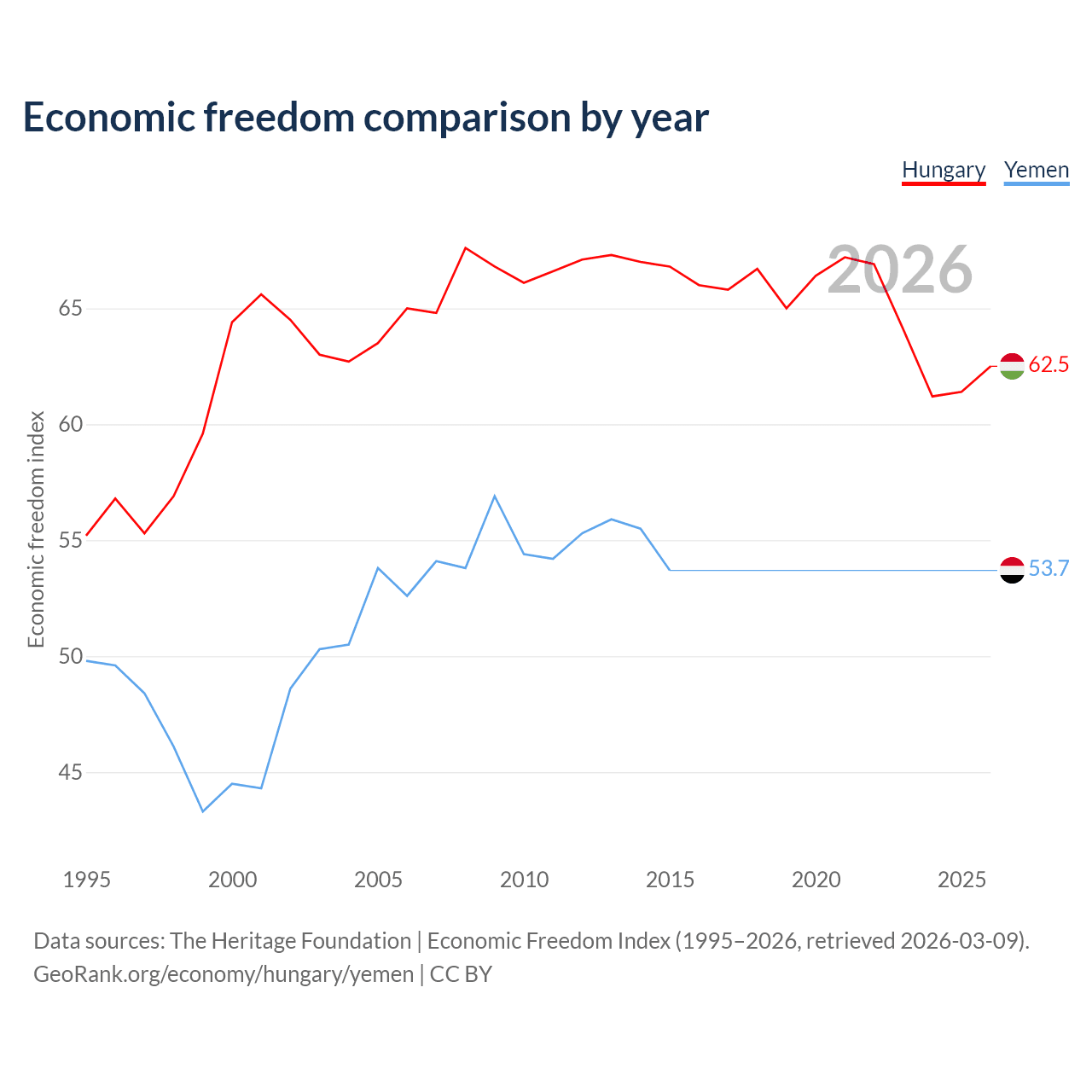 The Economic Freedom Index for Hungary is 62.5, ranking 86/197, compared to 53.7 for Yemen, ranking 138/197. The chart above displays a comparison of annual changes in economic freedom indexes.