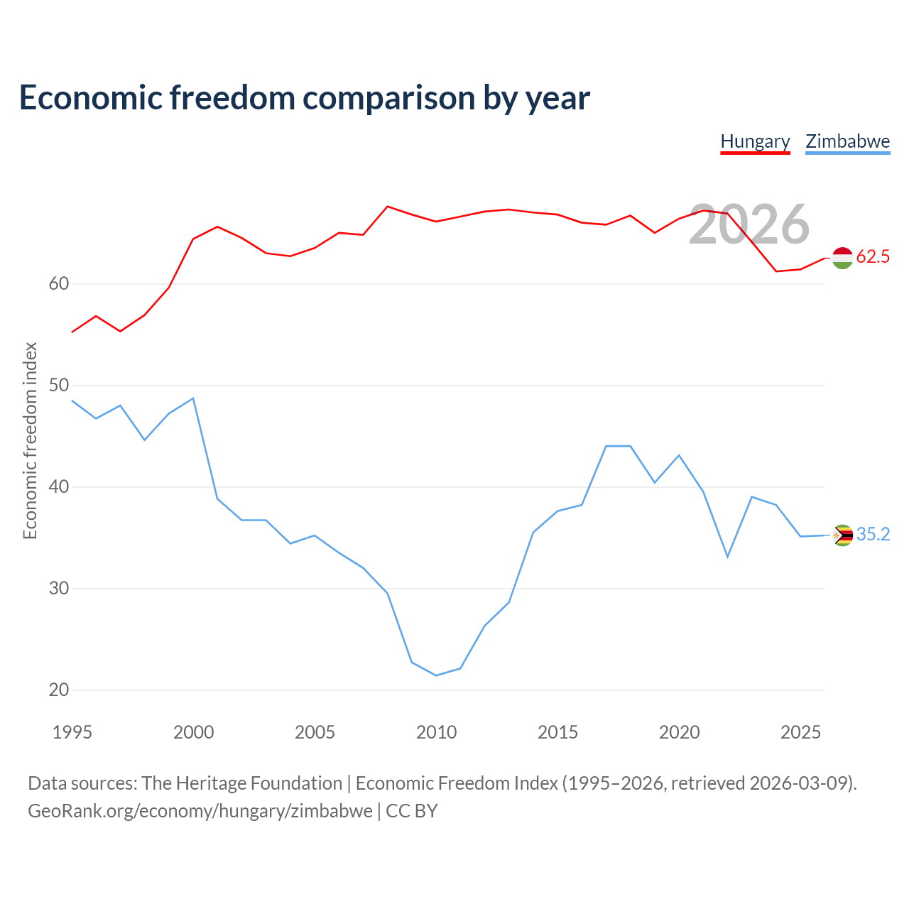 The Economic Freedom Index for Hungary is 62.5, ranking 86/197, compared to 35.2 for Zimbabwe, ranking 190/197. The chart above displays a comparison of annual changes in economic freedom indexes.