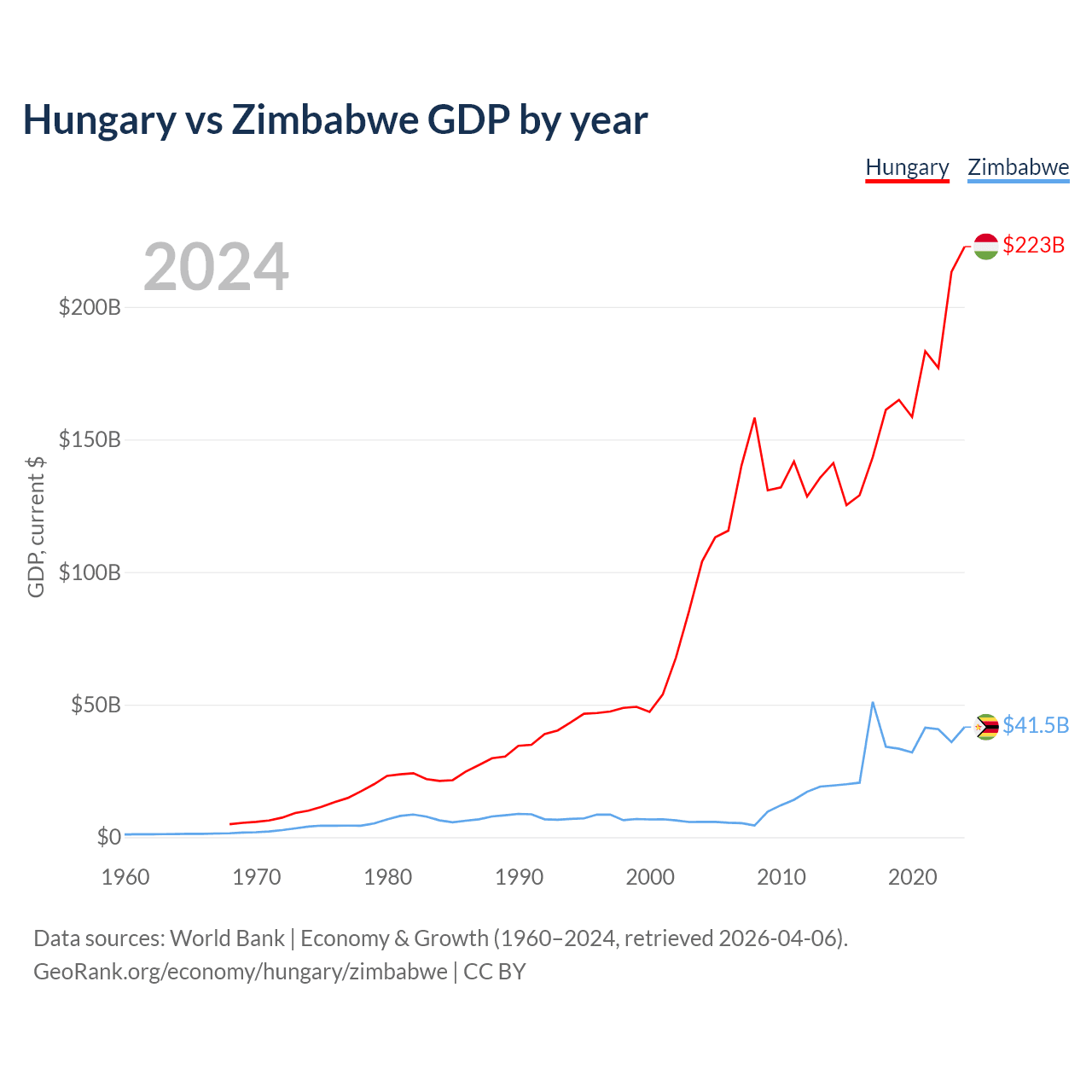 Hungary has a GDP of $223B compared to $41.5B for Zimbabwe, ranking 55/197 and 102/197 by economy size, respectively.