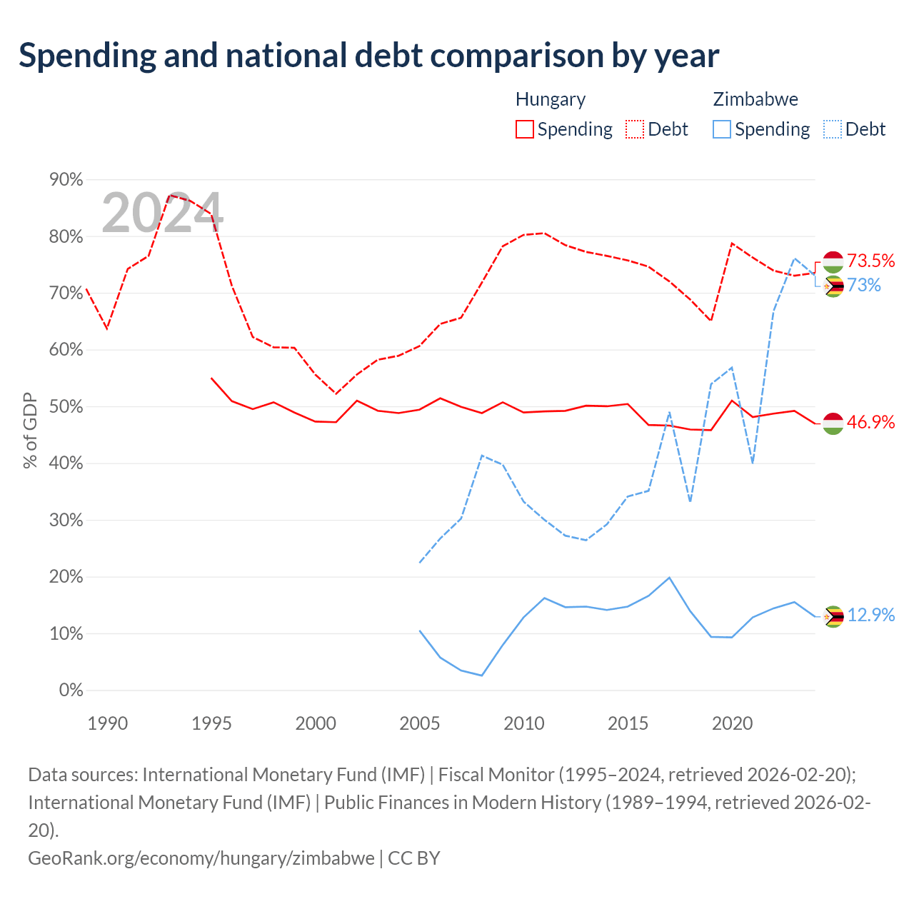 Hungary has $164B in government debt (73.5% of GDP), compared to $30.3B (73% of GDP) in Zimbabwe.