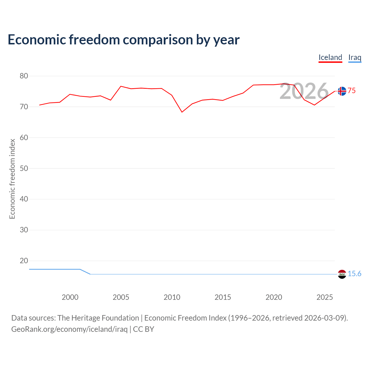 The Economic Freedom Index for Iceland is 75, ranking 19/197, compared to 15.6 for Iraq, ranking 196/197. The chart above displays a comparison of annual changes in economic freedom indexes.