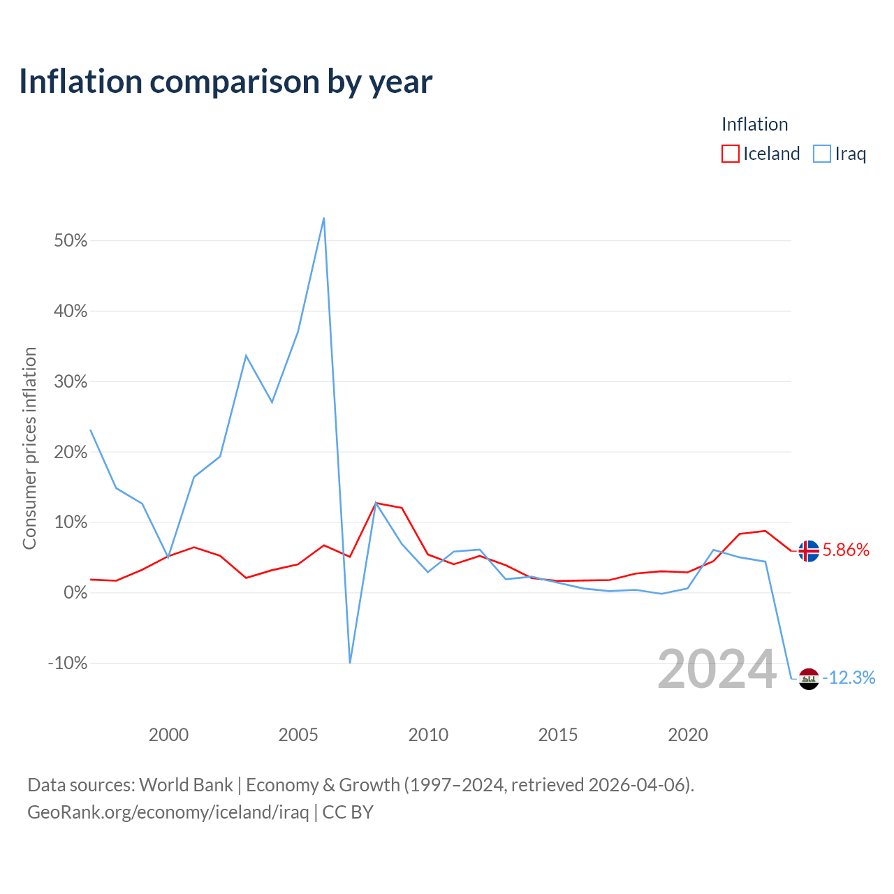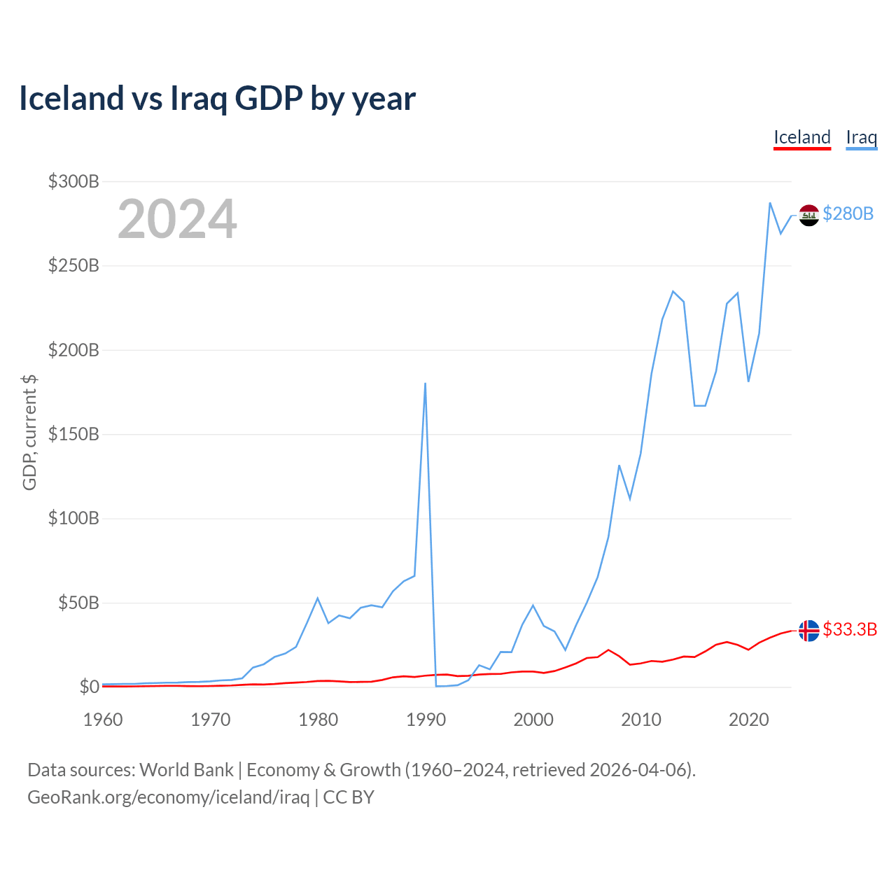 Iceland has a GDP of $33.3B compared to $280B for Iraq, ranking 108/197 and 50/197 by economy size, respectively.