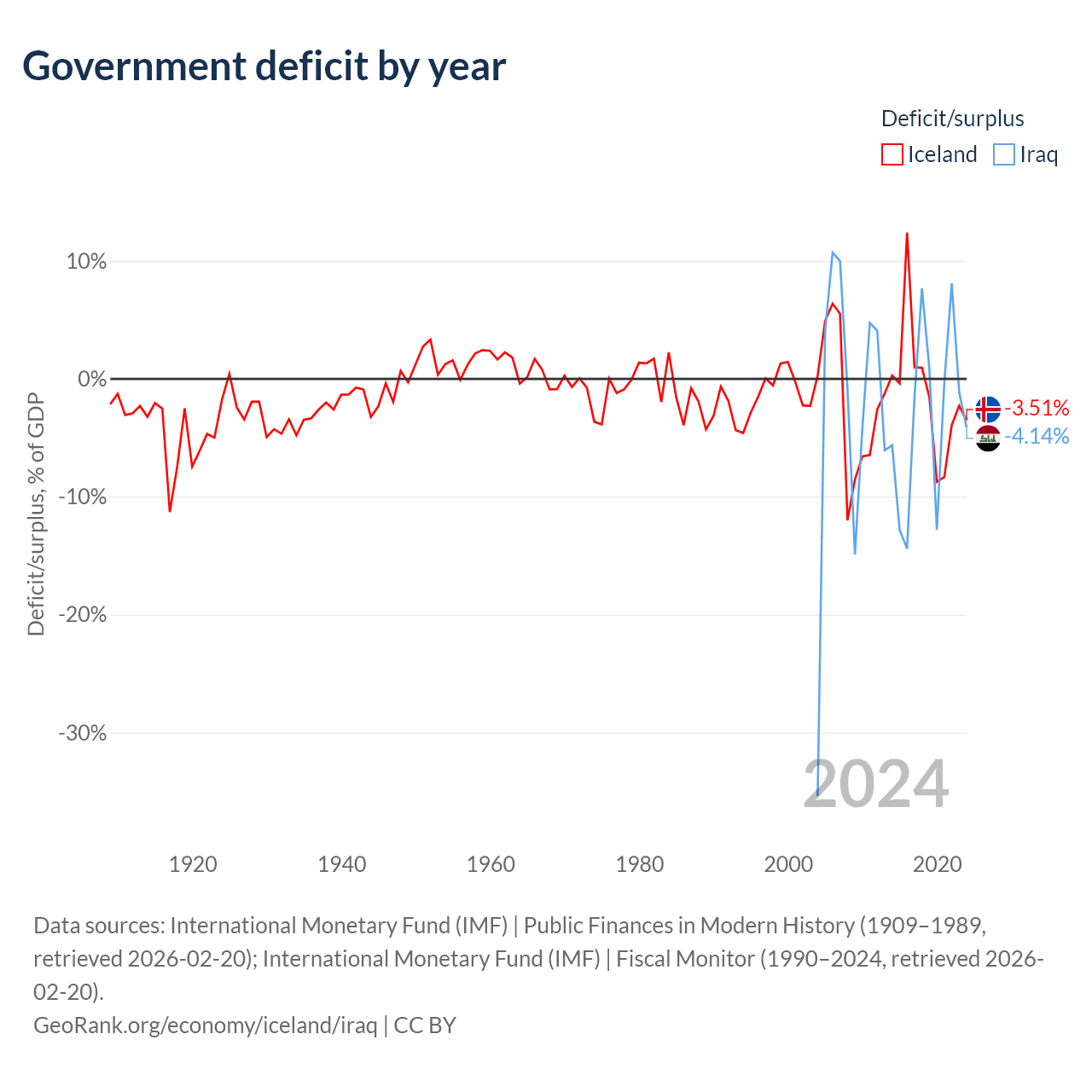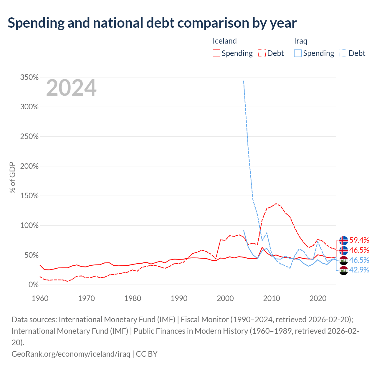 Iceland has $19.8B in government debt (59.4% of GDP), compared to $130B (46.5% of GDP) in Iraq.