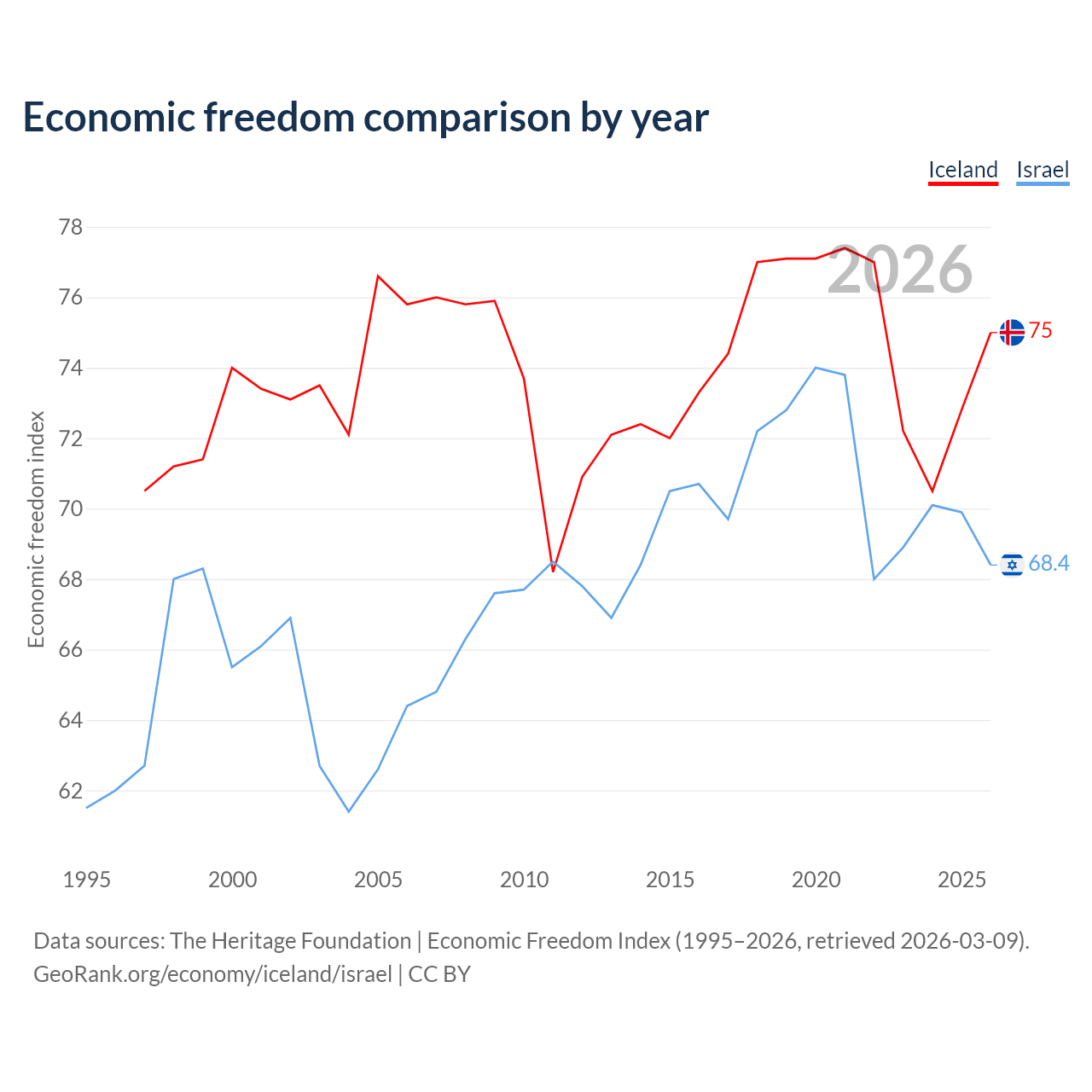 The Economic Freedom Index for Iceland is 75, ranking 19/197, compared to 68.4 for Israel, ranking 47/197. The chart above displays a comparison of annual changes in economic freedom indexes.