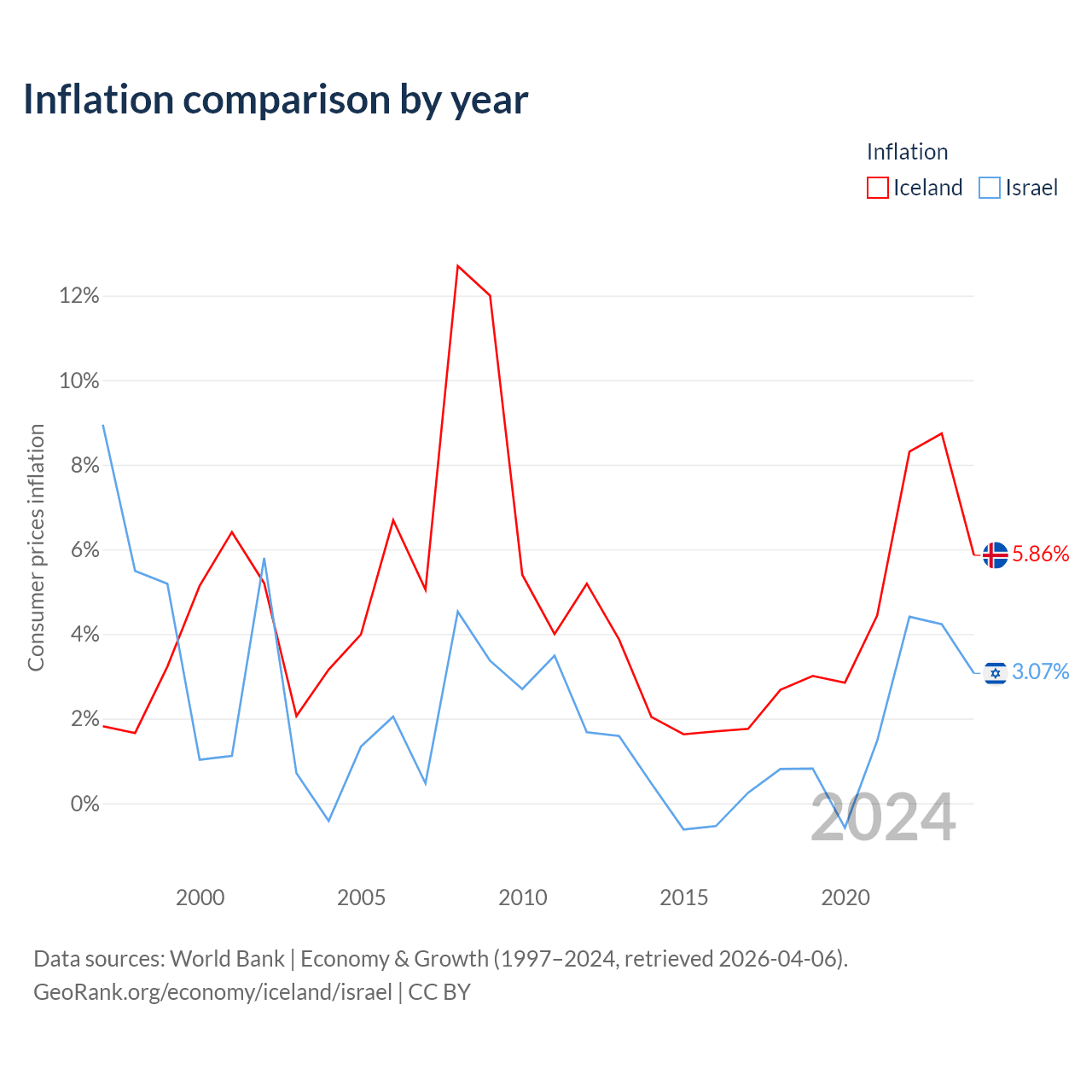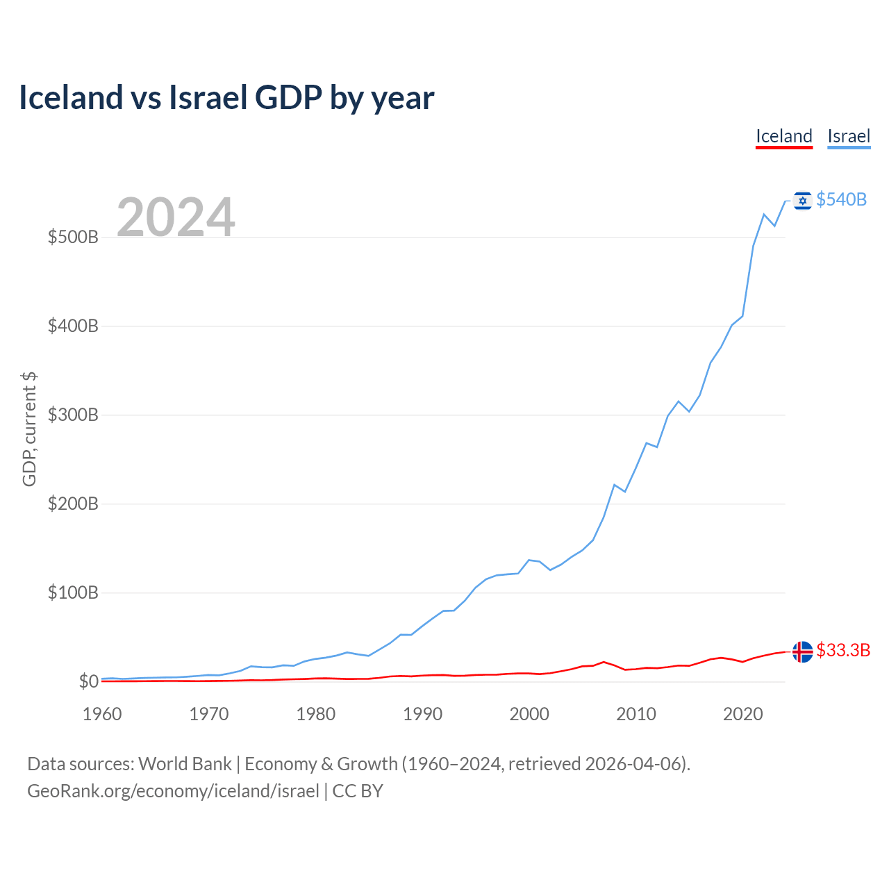 Iceland has a GDP of $33.3B compared to $540B for Israel, ranking 108/197 and 29/197 by economy size, respectively.