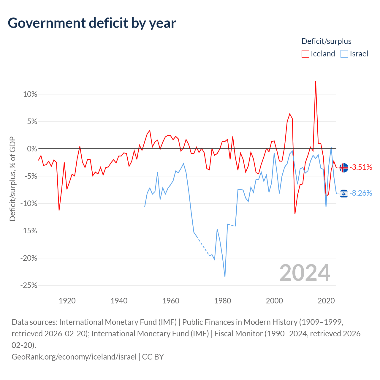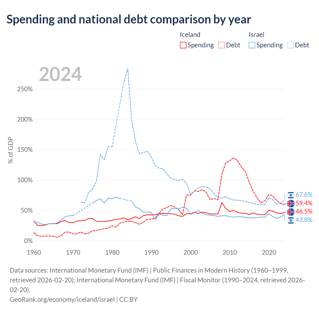 Iceland has $19.8B in government debt (59.4% of GDP), compared to $366B (67.6% of GDP) in Israel.