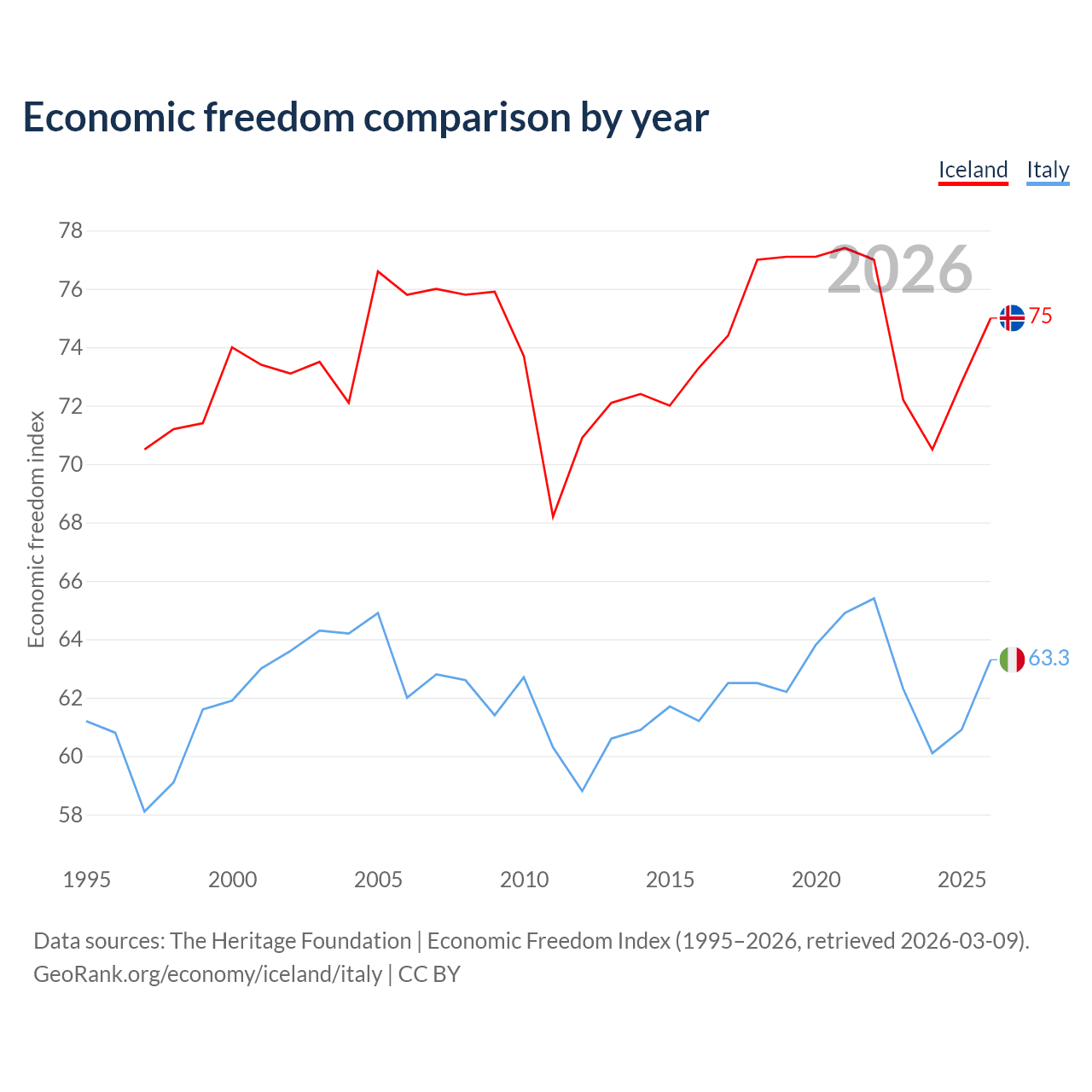 The Economic Freedom Index for Iceland is 75, ranking 19/197, compared to 63.3 for Italy, ranking 80/197. The chart above displays a comparison of annual changes in economic freedom indexes.