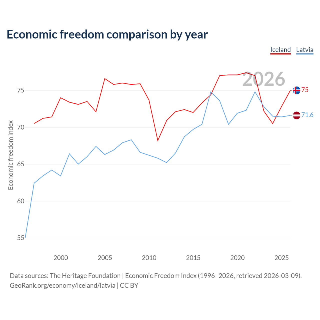 The Economic Freedom Index for Iceland is 75, ranking 19/197, compared to 71.6 for Latvia, ranking 31/197. The chart above displays a comparison of annual changes in economic freedom indexes.