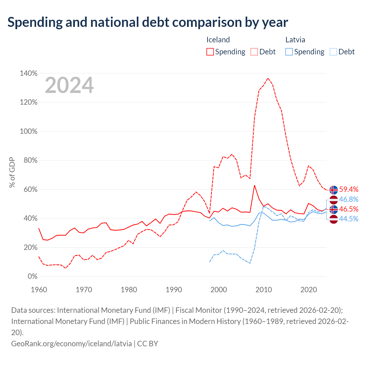 Iceland has $19.8B in government debt (59.4% of GDP), compared to $20.4B (46.8% of GDP) in Latvia.