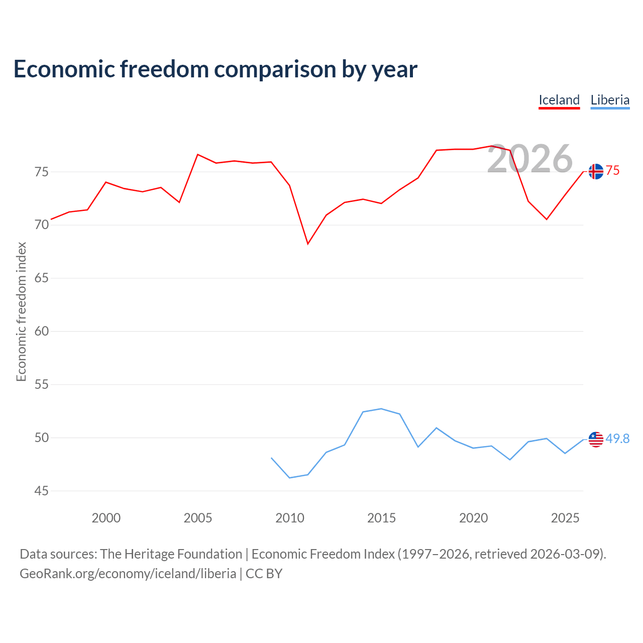 The Economic Freedom Index for Iceland is 75, ranking 19/197, compared to 49.8 for Liberia, ranking 163/197. The chart above displays a comparison of annual changes in economic freedom indexes.