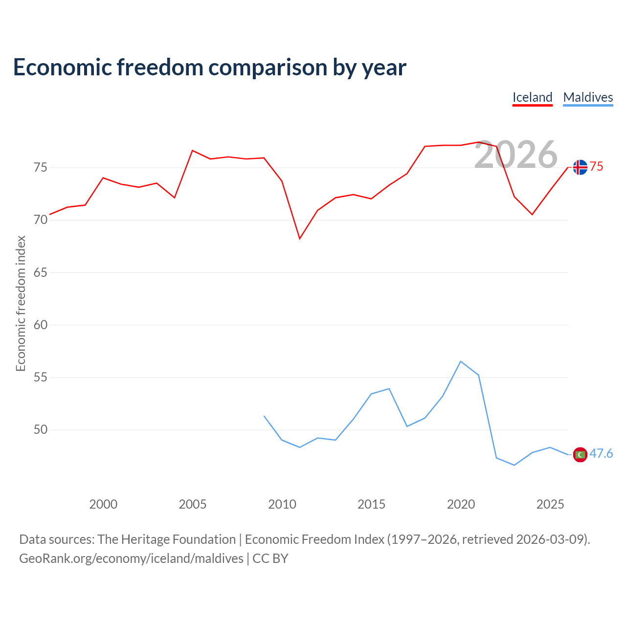 The Economic Freedom Index for Iceland is 75, ranking 19/197, compared to 47.6 for Maldives, ranking 174/197. The chart above displays a comparison of annual changes in economic freedom indexes.